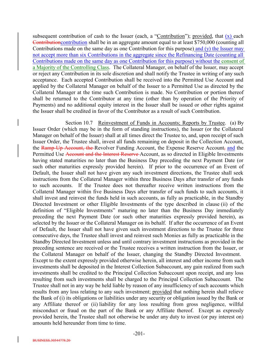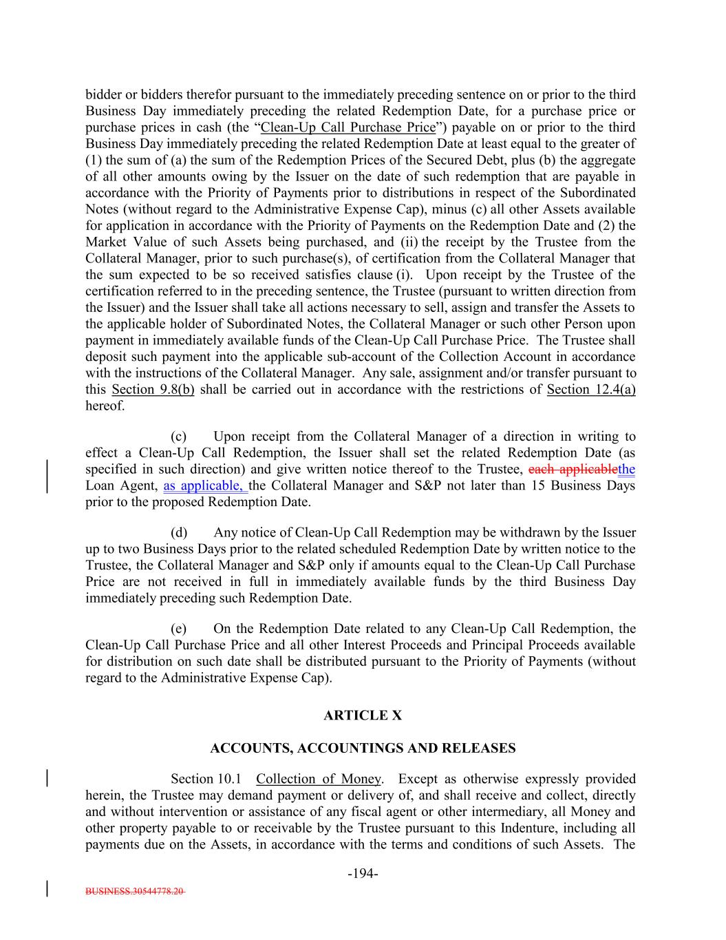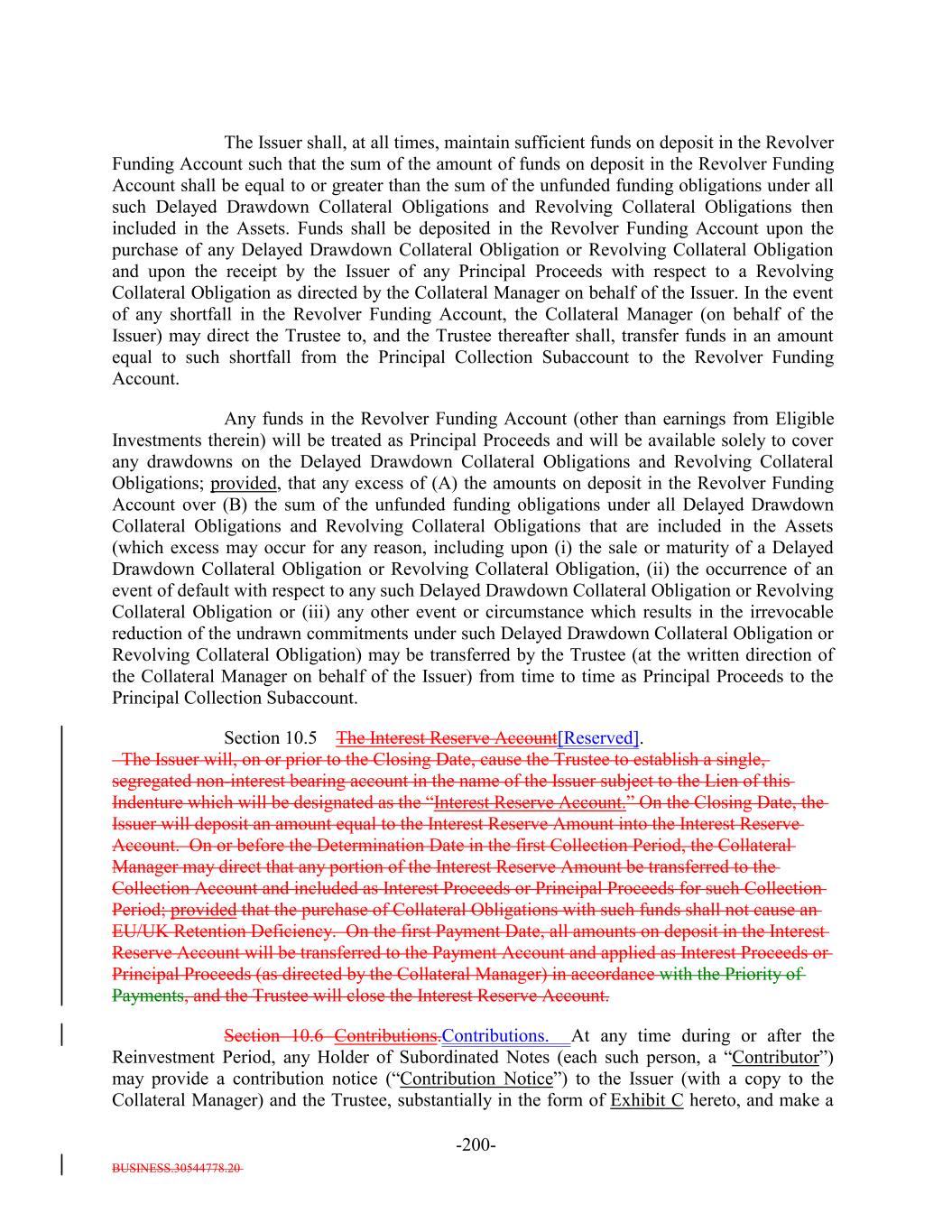 BUSINESS.30544778.20 TABLE OF CONTENTS (continued) Page -v- Section 9.8 Clean-Up Call Redemption. 181171 ARTICLE X ACCOUNTS, ACCOUNTINGS AND RELEASES Section 10.1 Collection of Money. 182173 Section 10.2 Collection Account. 183173 Section 10.3 Transaction Accounts. 185175 Section 10.4 The Revolver Funding Account. 187176 Section 10.5 The Interest Reserve Account. 188[Reserved]. 177 Section 10.6 Contributions. 188177 Section 10.7 Reinvestment of Funds in Accounts; Reports by Trustee. 188178 Section 10.8 Accountings. 190179 Section 10.9 EU Transparency Requirements. 198187 Section 10.10 Release of Assets. 199188 Section 10.11 Reports by Independent Accountants. 200189 Section 10.12 Reports to Rating Agencies and Additional Recipients. 202191 Section 10.13 Procedures Relating to the Establishment of Accounts Controlled by the Trustee. 202191 Section 10.14 Section 3(c)(7) Procedures. 202191 ARTICLE XI APPLICATION OF MONIES Section 11.1 Disbursements of Monies from Payment Account. 205194 ARTICLE XII SALE OF COLLATERAL OBLIGATIONS; PURCHASE OF ADDITIONAL COLLATERAL OBLIGATIONS Section 12.1 Sales of Collateral Obligations. 211200 Section 12.2 Purchase of Additional Collateral Obligations. 213202 Section 12.3 Reserved. 216205 Section 12.4 Conditions Applicable to All Sale and Purchase Transactions. 216205 Section 12.5 Hedging. 217206