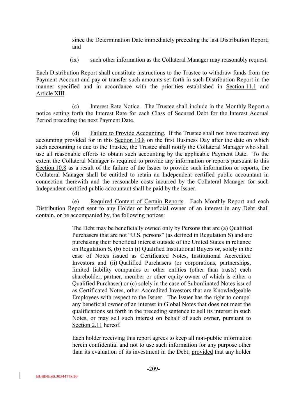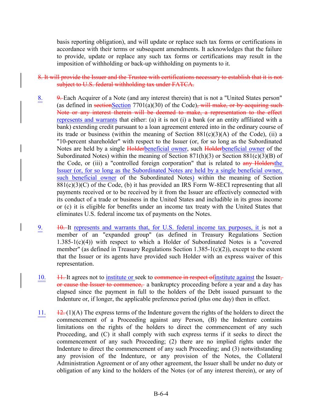 basis reporting obligation), and will update or replace such tax forms or certifications in accordance with their terms or subsequent amendments. It acknowledges that the failure to provide, update or replace any such tax forms or certifications may result in the imposition of withholding or back-up withholding on payments to it. 8. It will provide the Issuer and the Trustee with certifications necessary to establish that it is not subject to U.S. federal withholding tax under FATCA. 8. 9. Each Acquirer of a Note (and any interest therein) that is not a "United States person" (as defined in sectionSection 7701(a)(30) of the Code), will make, or by acquiring such Note or any interest therein will be deemed to make, a representation to the effect represents and warrants that either: (a) it is not (i) a bank (or an entity affiliated with a bank) extending credit pursuant to a loan agreement entered into in the ordinary course of its trade or business (within the meaning of Section 881(c)(3)(A) of the Code), (ii) a "10-percent shareholder" with respect to the Issuer (or, for so long as the Subordinated Notes are held by a single Holderbeneficial owner, such Holderbeneficial owner of the Subordinated Notes) within the meaning of Section 871(h)(3) or Section 881(c)(3)(B) of the Code, or (iii) a "controlled foreign corporation" that is related to any Holdersthe Issuer (or, for so long as the Subordinated Notes are held by a single beneficial owner, such beneficial owner of the Subordinated Notes) within the meaning of Section 881(c)(3)(C) of the Code, (b) it has provided an IRS Form W-8ECI representing that all payments received or to be received by it from the Issuer are effectively connected with its conduct of a trade or business in the United States and includible in its gross income or (c) it is eligible for benefits under an income tax treaty with the United States that eliminates U.S. federal income tax of payments on the Notes. 9. 10. It represents and warrants that, for U.S. federal income tax purposes, it is not a member of an "expanded group" (as defined in Treasury Regulations Section 1.385-1(c)(4)) with respect to which a Holder of Subordinated Notes is a "covered member" (as defined in Treasury Regulations Section 1.385-1(c)(2)), except to the extent that the Issuer or its agents have provided such Holder with an express waiver of this representation. 10. 11. It agrees not to institute or seek to commence in respect ofinstitute against the Issuer, or cause the Issuer to commence, a bankruptcy proceeding before a year and a day has elapsed since the payment in full to the holders of the Debt issued pursuant to the Indenture or, if longer, the applicable preference period (plus one day) then in effect. 11. 12. (1)(A) The express terms of the Indenture govern the rights of the holders to direct the commencement of a Proceeding against any Person, (B) the Indenture contains limitations on the rights of the holders to direct the commencement of any such Proceeding, and (C) it shall comply with such express terms if it seeks to direct the commencement of any such Proceeding; (2) there are no implied rights under the Indenture to direct the commencement of any such Proceeding; and (3) notwithstanding any provision of the Indenture, or any provision of the Notes, the Collateral Administration Agreement or of any other agreement, the Issuer shall be under no duty or obligation of any kind to the holders of the Notes (or of any interest therein), or any of B-6-4