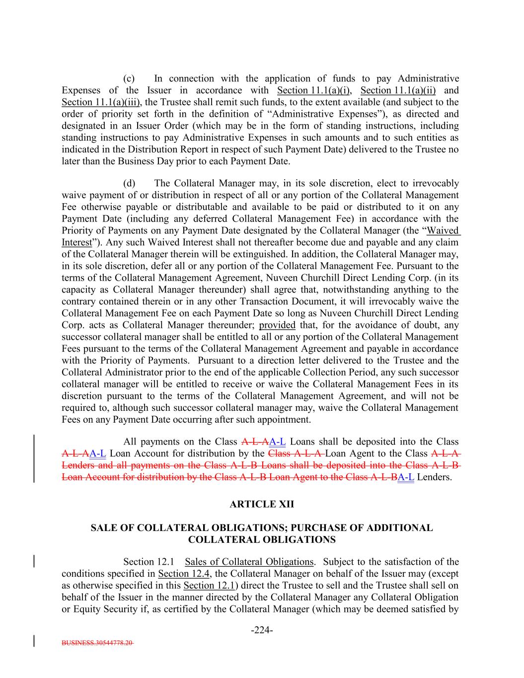BUSINESS.30544778.20 -16- amount equal to 0.20% per annum (calculated on the basis of the actual number of days in the applicable Interest Accrual Period divided by 360) of the Fee Basis Amount at the beginning of the Collection Period relating to such Payment Date. “Collateral Management Fee Shortfall Amount”: To the extent the Collateral Management Fee is not paid on a Payment Date due to insufficient Interest Proceeds or Principal Proceeds (and such fee was not voluntarily deferred or waived by the Collateral Manager), the Collateral Management Fee due on such Payment Date (or the unpaid portion thereof, as applicable), which shall be automatically deferred for payment on the succeeding Payment Date, with interest at the rate specified in the Collateral Management Agreement, as certified to the Trustee by the Collateral Manager, in accordance with the Priority of Payments. “Collateral Manager”: Nuveen Churchill Direct Lending Corp., a Maryland corporation, until a successor Person shall have become the Collateral Manager pursuant to the provisions of the Collateral Management Agreement, and thereafter “Collateral Manager” shall mean such successor Person. “Collateral Manager Standard”: The standard of care applicable to the Collateral Manager set forth in the Collateral Management Agreement. “Collateral Obligation”: A Senior Secured Loan (including, but not limited to, interests in middle market loans acquired by way of a purchase or assignment) or Participation Interest therein, a Second Lien Loan or Participation Interest therein, or a DIP Collateral Obligation or a Participation Interest therein, that as of the date of acquisition by the Issuer: (i) is U.S. Dollar denominated and is neither convertible by the Obligor thereof into, nor payable in, any other currency; (ii) is not (A) a Defaulted Obligation or (B) a Credit Risk Obligation; (iii) is not a lease; (iv) if it is a Deferrable Obligation, it is a Permitted Deferrable Obligation; (v) provides for a fixed amount of principal payable in Cash on scheduled payment dates and/or at maturity and does not by its terms provide for earlier amortization or prepayment at a price of less than par; (vi) does not constitute Margin Stock; (vii) gives rise only to payments that are not subject to withholding tax, other than withholding tax imposed on commitment fees and other similar fees, withholding imposed pursuant to FATCA and withholding tax as to which the Obligor must make additional payments so that the net amount received by the Issuer after satisfaction of such tax is the amount due to the Issuer before the imposition of any withholding tax; (viii) has an S&P Rating;