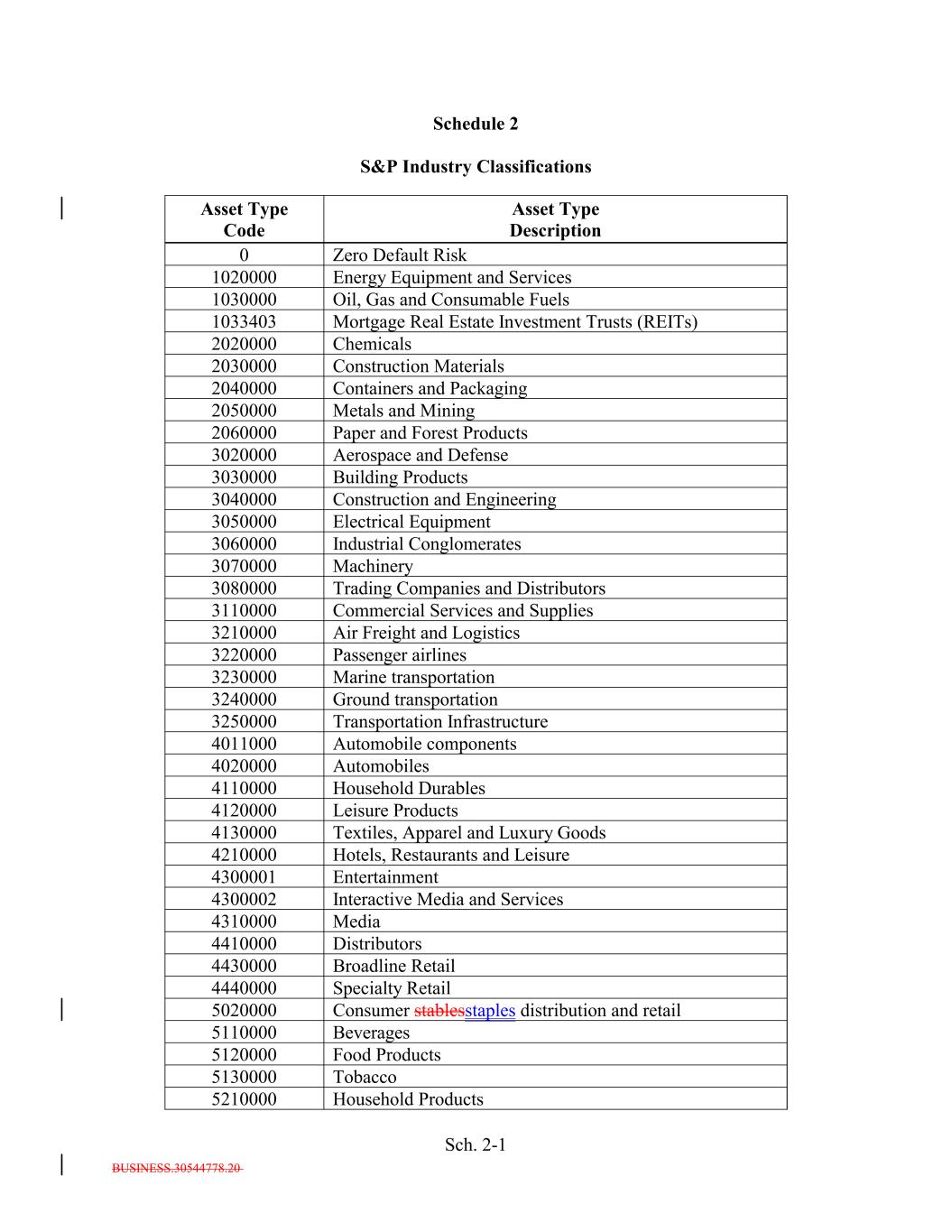 BUSINESS.30544778.20 Sch. 2-1 3230000 Paper and Forest Products Marine transportation 1033403 3240000 Zero Default Risk Ground transportation 3020000 Mortgage Real Estate Investment Trusts (REITs) 3250000 Aerospace and Defense Transportation Infrastructure Asset Type Code 4011000 Automobile components 3030000 4020000 Building Products Automobiles 2020000 4110000 Household Durables 3040000 Chemicals 4120000 Construction and Engineering Leisure Products 1020000 4130000 Textiles, Apparel and Luxury Goods 3050000 Asset Type Description 4210000 Electrical Equipment Hotels, Restaurants and Leisure 2030000 4300001 Energy Equipment and Services Entertainment 3060000 Construction Materials 4300002 Industrial Conglomerates Interactive Media and Services Schedule 2 S&P Industry Classifications 4310000 Media 3070000 4410000 Machinery Distributors 2040000 4430000 Broadline Retail 3080000 Containers and Packaging 4440000 Trading Companies and Distributors Specialty Retail 1030000 5020000 Consumer stablesstaples distribution and retail 3110000 5110000 Commercial Services and Supplies Beverages 2050000 5120000 Oil, Gas and Consumable Fuels Food Products 3210000 Metals and Mining 5130000 Air Freight and Logistics Tobacco 0 5210000 Household Products 3220000 Passenger airlines 2060000