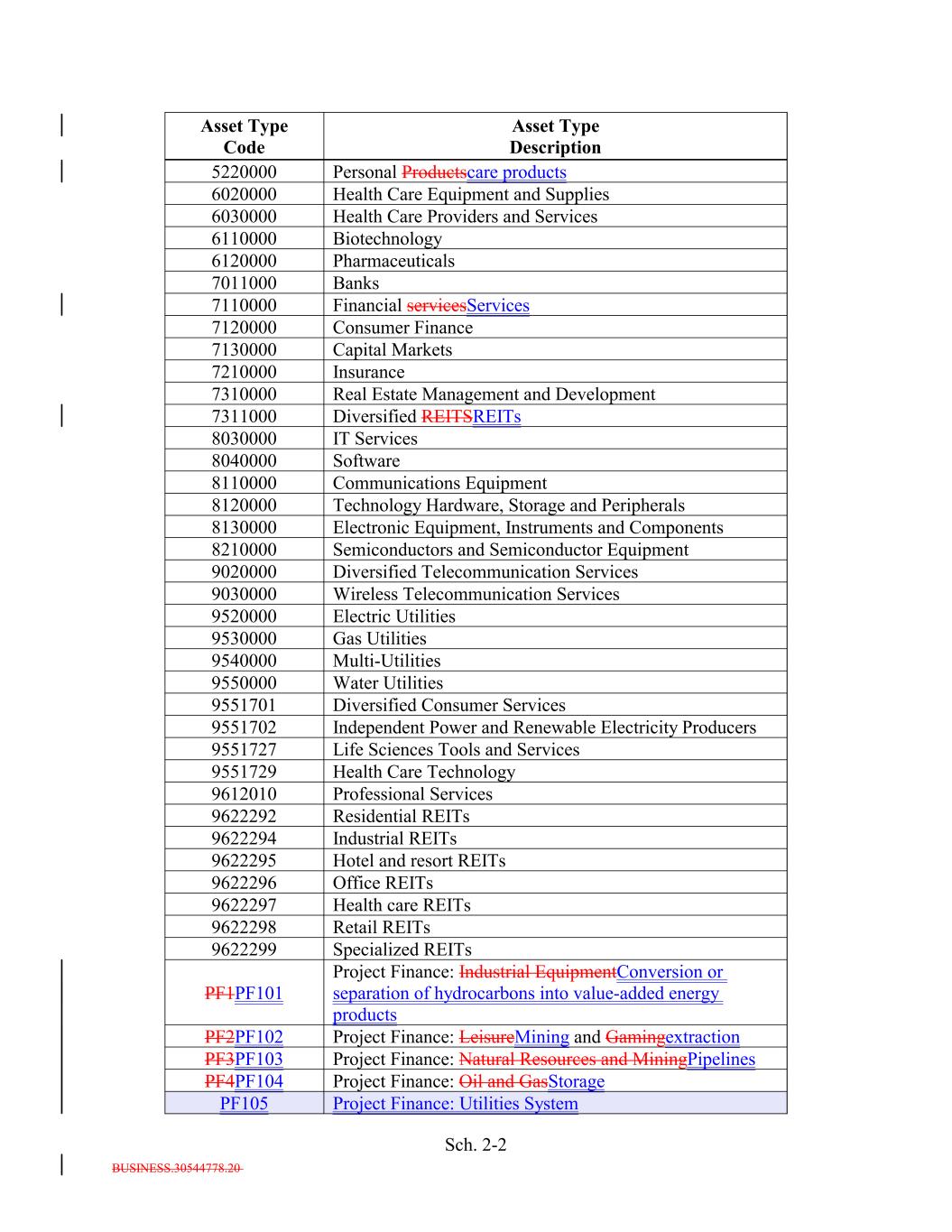 BUSINESS.30544778.20 Sch. 2-2 7210000 Electric Utilities Insurance 9530000 Gas Utilities Asset Type Description 9540000 7310000 Multi-Utilities 6120000 Real Estate Management and Development 9550000 6020000 Water Utilities Pharmaceuticals 9551701 7311000 Diversified Consumer Services Diversified REITSREITs 9551702 Independent Power and Renewable Electricity Producers Health Care Equipment and Supplies 9551727 8030000 Life Sciences Tools and Services 7011000 IT Services 9551729 Health Care Technology Banks 9612010 8040000 Professional Services Software 9622292 Residential REITs 9622294 8110000 Industrial REITs 7110000 Communications Equipment 9622295 6030000 Hotel and resort REITs Financial servicesServices 9622296 8120000 Office REITs 5220000 Technology Hardware, Storage and Peripherals 9622297 Health care REITs Health Care Providers and Services 9622298 8130000 Retail REITs 7120000 Electronic Equipment, Instruments and Components 9622299 Asset Type Code Specialized REITs Consumer Finance PF1PF101 8210000 Project Finance: Industrial EquipmentConversion or separation of hydrocarbons into value-added energy products Semiconductors and Semiconductor Equipment PF2PF102 Project Finance: LeisureMining and Gamingextraction Personal Productscare products PF3PF103 9020000 Project Finance: Natural Resources and MiningPipelines 7130000 Diversified Telecommunication Services PF4PF104 6110000 Project Finance: Oil and GasStorage Capital Markets PF105 9030000 Project Finance: Utilities System Wireless Telecommunication Services Biotechnology 9520000