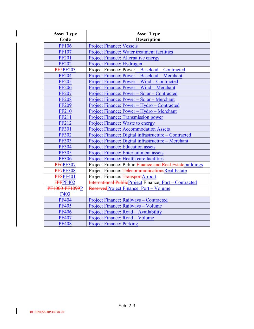 BUSINESS.30544778.20 Sch. 2-3 Project Finance: Power – Wind – Contracted PF302 PF106 Project Finance: Digital infrastructure – Contracted Project Finance: Alternative energy PF303 PF206 Project Finance: Digital infrastructure – Merchant Asset Type Code Project Finance: Power – Wind – Merchant PF304 Project Finance: Education assets Project Finance: Vessels PF305 PF207 Project Finance: Entertainment assets PF202 Project Finance: Power – Solar – Contracted PF306 Project Finance: Health care facilities Project Finance: Hydrogen PF6PF307 PF208 Project Finance: Public Finance and Real Estatebuildings Project Finance: Power – Solar – Merchant PF7PF308 Project Finance: TelecommunicationsReal Estate Asset Type Description PF8PF401 PF209 Project Finance: TransportAirport PF5PF203 Project Finance: Power – Hydro – Contracted IPFPF402 PF107 International PublicProject Finance: Port – Contracted Project Finance: Power – Baseload – Contracted PF1000-PF1099P F403 PF210 ReservedProject Finance: Port – Volume Project Finance: Power – Hydro – Merchant PF404 Project Finance: Railways – Contracted Project Finance: Water treatment facilities PF405 PF211 Project Finance: Railways – Volume PF204 Project Finance: Transmission power PF406 Project Finance: Road – Availability Project Finance: Power – Baseload – Merchant PF407 PF212 Project Finance: Road – Volume Project Finance: Waste to energy PF408 Project Finance: Parking PF301 PF205 Project Finance: Accommodation Assets PF201