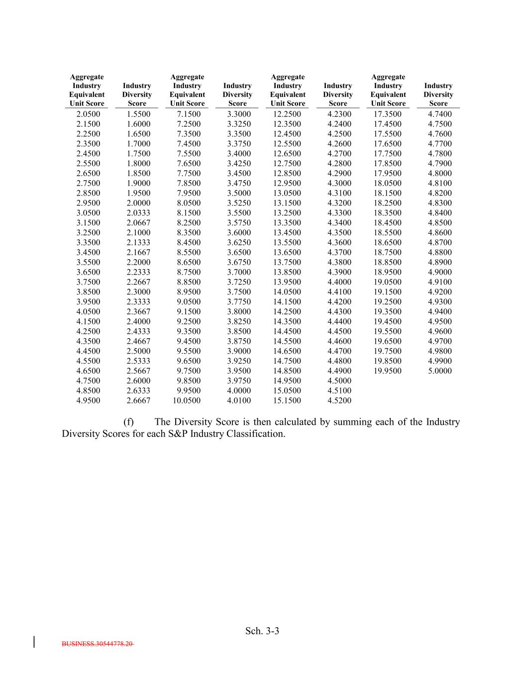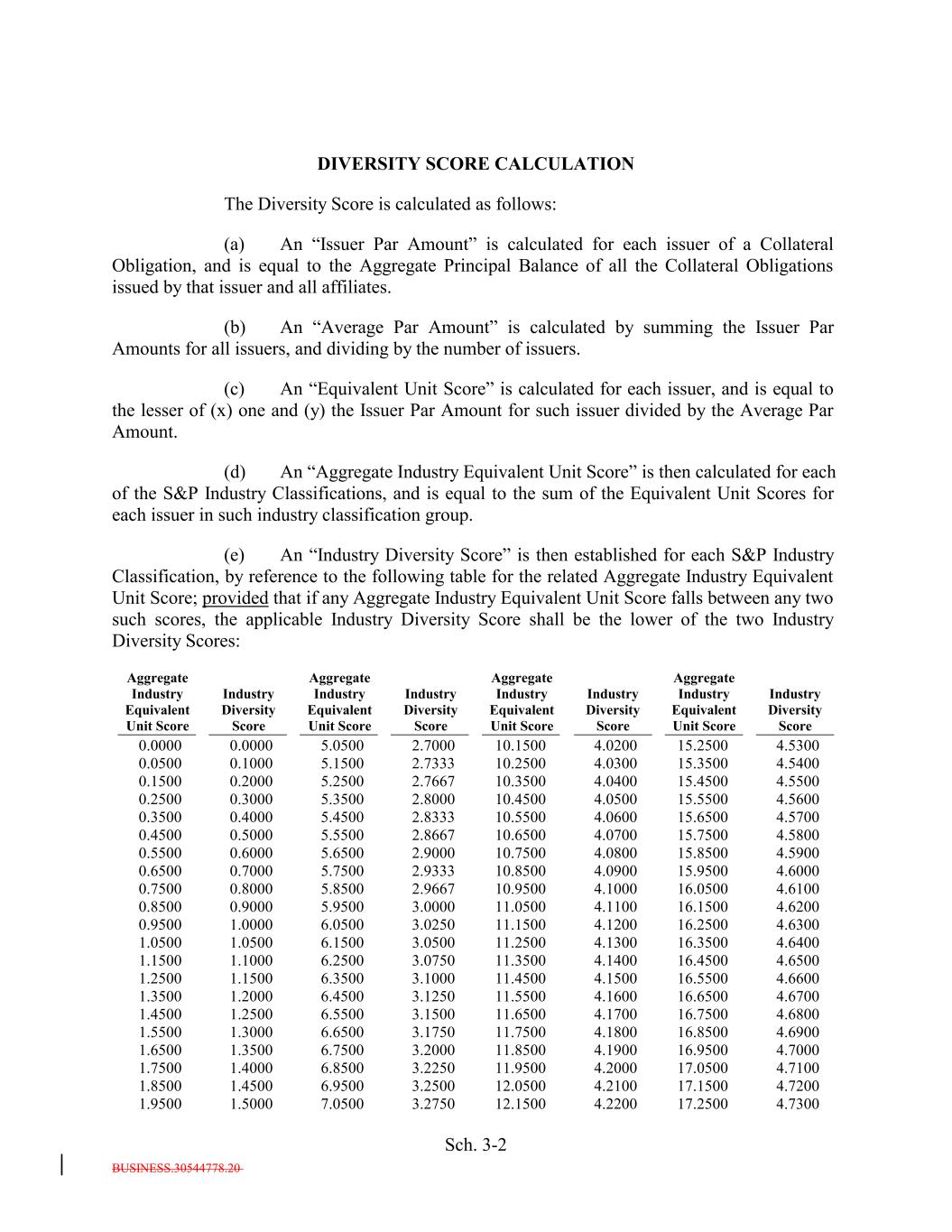 BUSINESS.30544778.20 Sch. 3-2 0.9500 Aggregate Industry Equivalent Unit Score 1.0000 2.8333 6.0500 10.2500 3.0250 10.5500 11.1500 0.0000 4.1200 4.0600 16.2500 4.0300 4.6300 15.6500 1.0500 4.5700 1.0500 15.3500 6.1500 3.0500 0.0000 11.2500 0.4500 4.1300 4.5400 16.3500 0.5000 4.6400 Industry Diversity Score 5.5500 1.1500 1.1000 2.8667 6.2500 5.0500 3.0750 10.6500 11.3500 0.1500 4.1400 4.0700 16.4500 4.6500 15.7500 0.2000 1.2500 4.5800 1.1500 2.7000 6.3500 3.1000 5.2500 11.4500 0.5500 4.1500 Aggregate Industry Equivalent Unit Score 16.5500 0.6000 4.6600 2.7667 5.6500 1.3500 10.1500 1.2000 2.9000 6.4500 10.3500 3.1250 10.7500 11.5500 Aggregate Industry Equivalent Unit Score 4.1600 4.0800 16.6500 4.0400 4.6700 15.8500 4.0200 1.4500 4.5900 1.2500 15.4500 6.5500 3.1500 Industry Diversity Score 11.6500 0.6500 4.1700 4.5500 16.7500 0.7000 4.6800 15.2500 5.7500 1.5500 1.3000 2.9333 6.6500 3.1750 10.8500 11.7500 0.2500 4.1800 4.0900 16.8500 4.5300 4.6900 15.9500 0.3000 1.6500 4.6000 1.3500 Aggregate Industry Equivalent Unit Score 6.7500 3.2000 5.3500 11.8500 0.7500 4.1900 16.9500 0.8000 4.7000 2.8000 5.8500 1.7500 Industry Diversity Score 1.4000 2.9667 6.8500 10.4500 3.2250 10.9500 11.9500 0.0500 4.2000 4.1000 17.0500 4.0500 4.7100 16.0500 Industry Diversity Score 1.8500 4.6100 1.4500 15.5500 6.9500 3.2500 0.1000 12.0500 0.8500 4.2100 4.5600 17.1500 0.9000 4.7200 DIVERSITY SCORE CALCULATION The Diversity Score is calculated as follows: (a) An “Issuer Par Amount” is calculated for each issuer of a Collateral Obligation, and is equal to the Aggregate Principal Balance of all the Collateral Obligations issued by that issuer and all affiliates. (b) An “Average Par Amount” is calculated by summing the Issuer Par Amounts for all issuers, and dividing by the number of issuers. (c) An “Equivalent Unit Score” is calculated for each issuer, and is equal to the lesser of (x) one and (y) the Issuer Par Amount for such issuer divided by the Average Par Amount. (d) An “Aggregate Industry Equivalent Unit Score” is then calculated for each of the S&P Industry Classifications, and is equal to the sum of the Equivalent Unit Scores for each issuer in such industry classification group. (e) An “Industry Diversity Score” is then established for each S&P Industry Classification, by reference to the following table for the related Aggregate Industry Equivalent Unit Score; provided that if any Aggregate Industry Equivalent Unit Score falls between any two such scores, the applicable Industry Diversity Score shall be the lower of the two Industry Diversity Scores: 5.9500 1.9500 1.5000 3.0000 7.0500 5.1500 3.2750 11.0500 12.1500 0.3500 4.2200 4.1100 17.2500 4.7300 16.1500 0.4000 4.6200 2.7333 5.4500