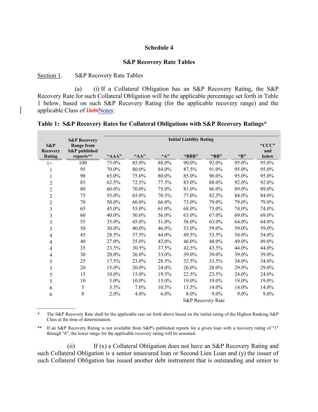 2 95 3 80 50 30.0% 60.0% 40.0% 70.0% 46.0% 70.0% 53.0% “B” 59.0% 75.0% 59.0% 80.0% 59.0% 81.0% 4 86.0% 45 84.0% 28.5% 89.0% 37.5% “CCC” and below 44.0% 89.0% 49.5% 87.5% 53.5% 54.0% 54.0% 2 91.0% 4 75 40 27.0% 55.0% 35.0% 95.0% 42.0% 65.0% 46.0% S&P Recovery Rating 48.0% 70.5% 49.0% 95.0% 49.0% 77.0% 1+ 4 82.5% 35 23.5% 84.0% 30.5% 37.5% 84.0% 42.5% 1 43.5% 44.0% 100 44.0% 2 90 4 70 30 20.0% 50.0% 26.0% 65.0% 33.0% 60.0% 39.0% 75.0% 39.0% 66.0% 39.0% 75.0% 39.0% 73.0% “AAA” 5 79.0% 25 80.0% 17.5% 79.0% 23.0% 85.0% 28.5% 79.0% 32.5% 85.0% 33.5% 34.0% S&P Recovery Range from S&P published reports** 34.0% 3 90.0% 5 65 20 88.0% 15.0% 45.0% 20.0% 95.0% 24.0% 55.0% 26.0% “AA” 28.0% 61.0% 29.0% 95.0% 29.0% 68.0% 90.0% 5 73.0% 15 10.0% 74.0% 15.0% Schedule 4 S&P Recovery Rate Tables Section 1. S&P Recovery Rate Tables (a) (i) If a Collateral Obligation has an S&P Recovery Rating, the S&P Recovery Rate for such Collateral Obligation will be the applicable percentage set forth in Table 1 below, based on such S&P Recovery Rating (for the applicable recovery range) and the applicable Class of DebtNotes: Table 1: S&P Recovery Rates for Collateral Obligations with S&P Recovery Ratings* 19.5% 74.0% 22.5% 2 23.5% 24.0% 92.0% 24.0% 3 85 5 60 10 “A” 5.0% 40.0% 10.0% 62.5% 15.0% 50.0% 19.0% 95.0% 19.0% 56.0% 19.0% 72.5% 19.0% 63.0% Initial Liability Rating 6 67.0% 5 77.5% 3.5% 69.0% 7.0% 95.0% 10.5% 69.0% 13.5% 83.0% 14.0% 14.0% “BBB” 14.0% 3 88.0% 6 55 0 2.0% 35.0% 4.0% 92.0% 6.0% 45.0% 8.0% 9.0% 51.0% 9.0% 92.0% 9.0% 58.0% 1 63.0% 64.0% S&P Recovery Rate “BB” * The S&P Recovery Rate shall be the applicable rate set forth above based on the initial rating of the Highest Ranking S&P Class at the time of determination. ** If an S&P Recovery Rating is not available from S&P's published reports for a given loan with a recovery rating of "1" through "6", the lower range for the applicable recovery rating will be assumed. (ii) If (x) a Collateral Obligation does not have an S&P Recovery Rating and such Collateral Obligation is a senior unsecured loan or Second Lien Loan and (y) the issuer of such Collateral Obligation has issued another debt instrument that is outstanding and senior to 64.0%