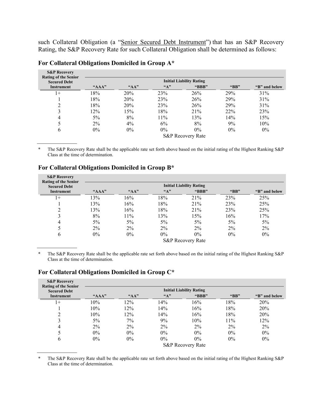 15% 25% “B” and below 3 26% 8% 5 11% 13% 2% 15% 29% 16% 4% 17% 6% 4 31% 5% 8% 5% 5% 9% 5% 5% 10% 5% 1+ 5 2 2% 6 2% 2% 0% 2% 18% 2% 0% 2% 18% 0% 6 20% 0% 0% 0% “AAA” 0% 0% 0% 23% 0% 0% 0% 20% 26% S&P Recovery Rate * The S&P Recovery Rate shall be the applicable rate set forth above based on the initial rating of the Highest Ranking S&P Class at the time of determination. For Collateral Obligations Domiciled in Group C* S&P Recovery Rating of the Senior Secured Debt Instrument S&P Recovery Rating of the Senior Secured Debt Instrument S&P Recovery Rate Initial Liability Rating 29% * The S&P Recovery Rate shall be the applicable rate set forth above based on the initial rating of the Highest Ranking S&P Class at the time of determination. For Collateral Obligations Domiciled in Group B* “AAA” 23% “AA” S&P Recovery Rating of the Senior Secured Debt Instrument “A” 31% “BBB” Initial Liability Rating “BB” “AA” “B” and below 1+ 10% 26% 12% “AAA” 14% 3 16% “AA” 18% 20% “A” 12% 1 “BBB” 10% 29% 12% “BB” 14% 15% 16% “B” and below 18% “A” 20% 18% 2 1+ 10% 31% 12% 13% 14% 21% 16% 16% 18% Initial Liability Rating 20% 18% 22% 3 21% 5% 7% 23% 9% 23% 10% 25% 11% “BBB” 12% 4 1 2% 1 2% 13% 2% 4 2% 16% 2% such Collateral Obligation (a “Senior Secured Debt Instrument”) that has an S&P Recovery Rating, the S&P Recovery Rate for such Collateral Obligation shall be determined as follows: For Collateral Obligations Domiciled in Group A* 2% 18% 5% 5 21% 0% 18% 0% 23% 0% 8% 0% 25% 0% “BB” 0% 11% 6 2 0% 20% 0% 13% 0% 13% 0% 16% 0% 0% 18% 14% 21% S&P Recovery Rate 23% * The S&P Recovery Rate shall be the applicable rate set forth above based on the initial rating of the Highest Ranking S&P Class at the time of determination. 23%
