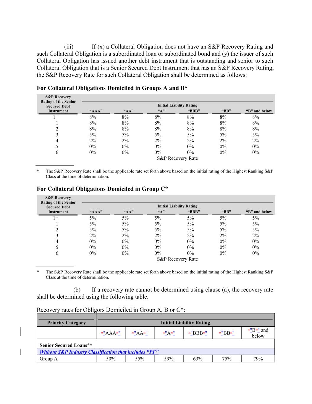 “B” and below “A” 5% 1+ 8% 5% 5% 5% Initial Liability Rating 5% 5% 5% 5% 5% 5% “BBB” 1 1 5% 4 5% (iii) If (x) a Collateral Obligation does not have an S&P Recovery Rating and such Collateral Obligation is a subordinated loan or subordinated bond and (y) the issuer of such Collateral Obligation has issued another debt instrument that is outstanding and senior to such Collateral Obligation that is a Senior Secured Debt Instrument that has an S&P Recovery Rating, the S&P Recovery Rate for such Collateral Obligation shall be determined as follows: For Collateral Obligations Domiciled in Groups A and B* 5% 2% 5% 8% 5% 2% 5% “BB” 2% 2 8% 5% 2% 5% 5% 2% 5% 8% 5% 2% 5% “B” and below 3 8% 2% 5 2% 2% 0% 2% 8% 2% 0% 2% 0% 4 8% 0% 0% 0% 0% 0% 0% 0% 0% 0% 1+ 5 2 0% 6 0% 0% 0% 0% 8% 0% 0% 0% 8% 0% 6 8% 0% 0% 0% “AAA” 0% 0% 0% 8% 0% 0% 0% 8% 8% S&P Recovery Rate * The S&P Recovery Rate shall be the applicable rate set forth above based on the initial rating of the Highest Ranking S&P Class at the time of determination. (b) If a recovery rate cannot be determined using clause (a), the recovery rate shall be determined using the following table. Recovery rates for Obligors Domiciled in Group A, B or C*: S&P Recovery Rating of the Senior Secured Debt Instrument Priority Category S&P Recovery Rate Initial Liability Rating 8% * The S&P Recovery Rate shall be the applicable rate set forth above based on the initial rating of the Highest Ranking S&P Class at the time of determination. For Collateral Obligations Domiciled in Group C* “"AAA”" 8% “"AA”" S&P Recovery Rating of the Senior Secured Debt Instrument “"A”" 8% “"BBB”" Initial Liability Rating “"BB”" “AA” “"B”" and below Senior Secured Loans** 8% Without S&P Industry Classification that includes "PF" “AAA” 3 Group A “AA” 50% 55% “A” 59% 5% 63% “BBB” 75% 8% 79% “BB” 5%