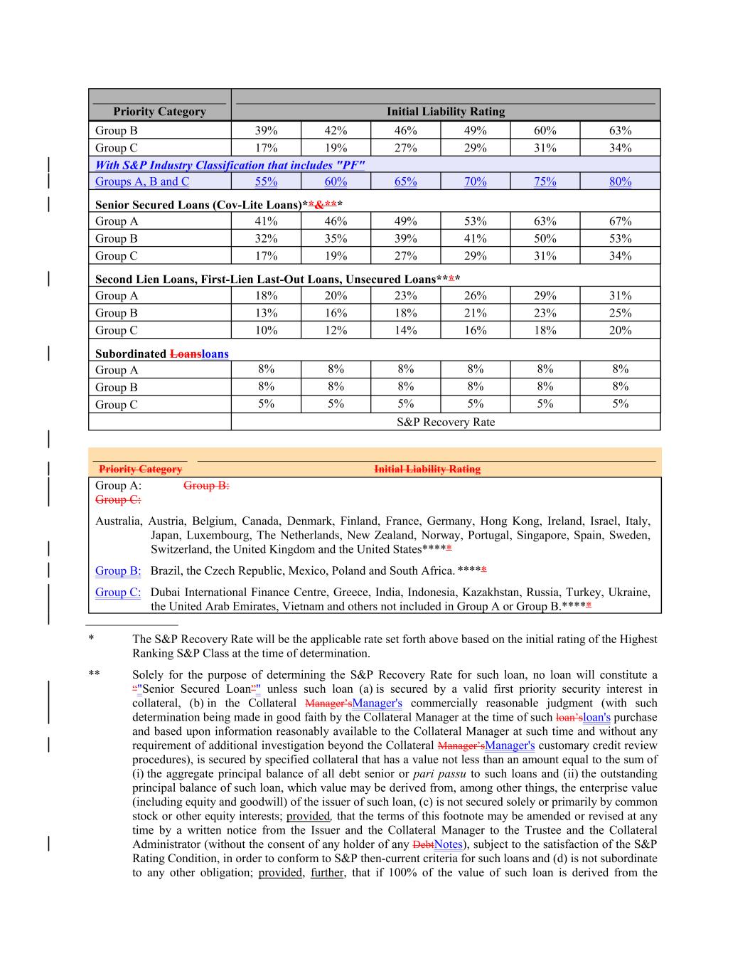 39% Group A 80% 18% 17% 20% 23% 26% Senior Secured Loans (Cov-Lite Loans)**&*** 29% 19% 31% 42% Group B Group A 13% 27% 16% 41% 18% Initial Liability Rating 21% 46% 23% 29% 25% 49% 46% Group C 53% 10% 31% 12% 63% 14% 16% 67% 18% 34% 20% 49% Subordinated Loansloans Group B Group A 32% 8% 8% 35% 8% With S&P Industry Classification that includes "PF" 8% 39% 8% 60% 8% 41% Group B 50% 8% 8% 53% 8% Groups A, B and C 8% 8% 63% 8% Group C 55% Group C 17% 5% Group B 5% 19% 5% 60% 5% 27% 5% 5% 29% 65% 31% S&P Recovery Rate Priority Category 34% Priority Category 70% Initial Liability Rating Group C Group A: Group B: Group C: Australia, Austria, Belgium, Canada, Denmark, Finland, France, Germany, Hong Kong, Ireland, Israel, Italy, Japan, Luxembourg, The Netherlands, New Zealand, Norway, Portugal, Singapore, Spain, Sweden, Switzerland, the United Kingdom and the United States***** Group B: Brazil, the Czech Republic, Mexico, Poland and South Africa. ***** Group C: Dubai International Finance Centre, Greece, India, Indonesia, Kazakhstan, Russia, Turkey, Ukraine, the United Arab Emirates, Vietnam and others not included in Group A or Group B.***** Second Lien Loans, First-Lien Last-Out Loans, Unsecured Loans**** * The S&P Recovery Rate will be the applicable rate set forth above based on the initial rating of the Highest Ranking S&P Class at the time of determination. ** Solely for the purpose of determining the S&P Recovery Rate for such loan, no loan will constitute a “"Senior Secured Loan”" unless such loan (a) is secured by a valid first priority security interest in collateral, (b) in the Collateral Manager’sManager's commercially reasonable judgment (with such determination being made in good faith by the Collateral Manager at the time of such loan’sloan's purchase and based upon information reasonably available to the Collateral Manager at such time and without any requirement of additional investigation beyond the Collateral Manager’sManager's customary credit review procedures), is secured by specified collateral that has a value not less than an amount equal to the sum of (i) the aggregate principal balance of all debt senior or pari passu to such loans and (ii) the outstanding principal balance of such loan, which value may be derived from, among other things, the enterprise value (including equity and goodwill) of the issuer of such loan, (c) is not secured solely or primarily by common stock or other equity interests; provided, that the terms of this footnote may be amended or revised at any time by a written notice from the Issuer and the Collateral Manager to the Trustee and the Collateral Administrator (without the consent of any holder of any DebtNotes), subject to the satisfaction of the S&P Rating Condition, in order to conform to S&P then-current criteria for such loans and (d) is not subordinate to any other obligation; provided, further, that if 100% of the value of such loan is derived from the 75%