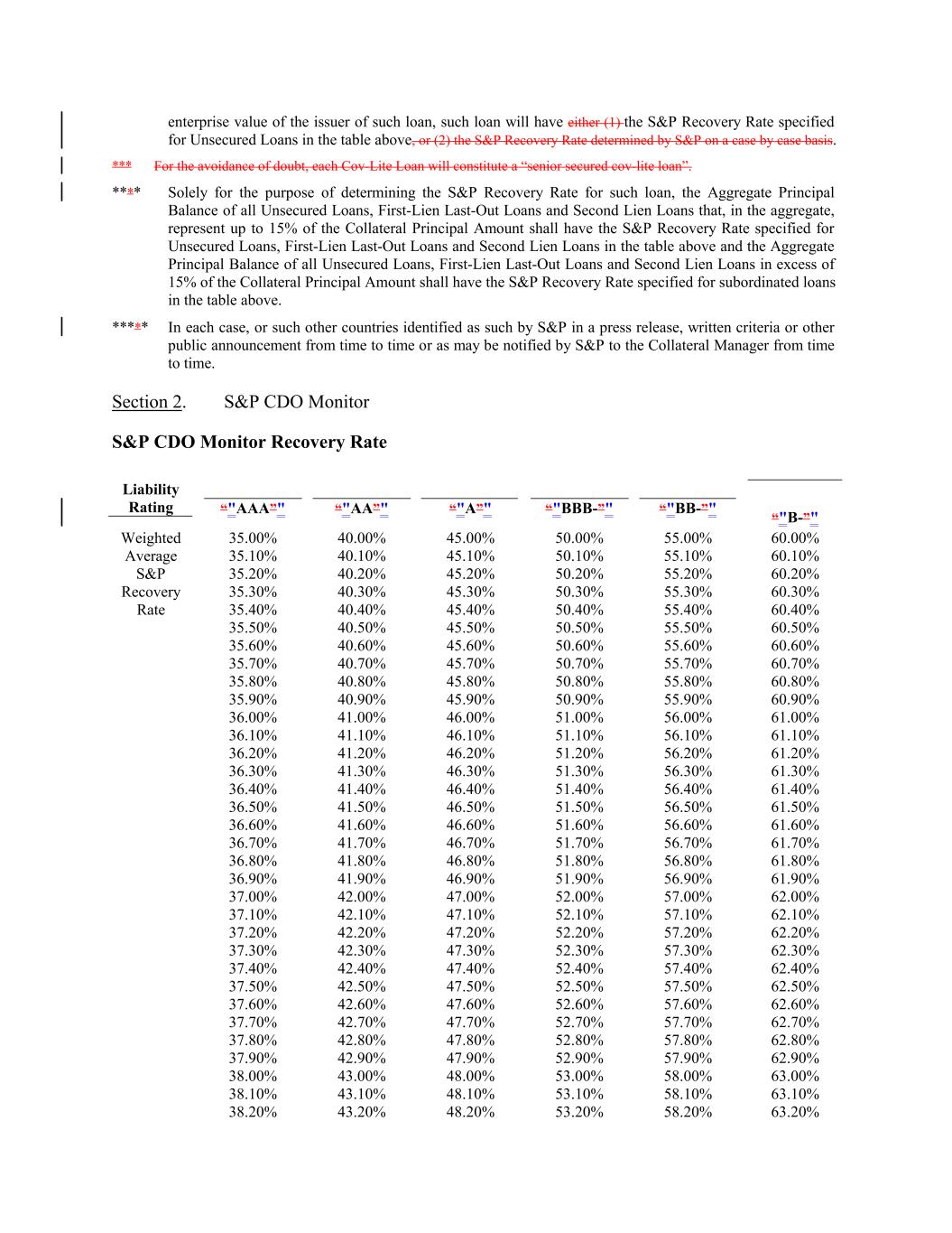 61.50% 35.70% 55.00% 40.70% 36.60% 41.60% 45.70% 46.60% Liability Rating 51.60% 50.70% 56.60% 61.60% 55.70% 60.00% 60.70% 36.70% 35.30% 41.70% 46.70% “"BB-”" 51.70% 56.70% 40.30% 61.70% 35.80% 40.80% 36.80% 45.30% 41.80% 45.80% 46.80% 51.80% 50.80% 56.80% 50.30% 61.80% 55.80% 60.80% 36.90% 55.30% 41.90% 46.90% “"B-”" 51.90% 56.90% 60.30% 61.90% 35.90% 35.10% 40.90% 37.00% 42.00% 45.90% 47.00% “"AAA”" 52.00% 50.90% 57.00% 62.00% 55.90% 40.10% 60.90% 37.10% 35.40% 42.10% 47.10% 52.10% 57.10% 40.40% 62.10% 36.00% 45.10% 41.00% 37.20% 45.40% 42.20% 46.00% 47.20% enterprise value of the issuer of such loan, such loan will have either (1) the S&P Recovery Rate specified for Unsecured Loans in the table above, or (2) the S&P Recovery Rate determined by S&P on a case by case basis. *** For the avoidance of doubt, each Cov-Lite Loan will constitute a “senior secured cov-lite loan”. **** Solely for the purpose of determining the S&P Recovery Rate for such loan, the Aggregate Principal Balance of all Unsecured Loans, First-Lien Last-Out Loans and Second Lien Loans that, in the aggregate, represent up to 15% of the Collateral Principal Amount shall have the S&P Recovery Rate specified for Unsecured Loans, First-Lien Last-Out Loans and Second Lien Loans in the table above and the Aggregate Principal Balance of all Unsecured Loans, First-Lien Last-Out Loans and Second Lien Loans in excess of 15% of the Collateral Principal Amount shall have the S&P Recovery Rate specified for subordinated loans in the table above. ***** In each case, or such other countries identified as such by S&P in a press release, written criteria or other public announcement from time to time or as may be notified by S&P to the Collateral Manager from time to time. Section 2. S&P CDO Monitor S&P CDO Monitor Recovery Rate 52.20% 51.00% 57.20% 50.40% 62.20% 56.00% 50.10% 61.00% 37.30% 55.40% 42.30% 47.30% Weighted Average S&P Recovery Rate 52.30% 57.30% 60.40% 62.30% 36.10% 55.10% 41.10% 37.40% 42.40% 46.10% 47.40% “"AA”" 52.40% 51.10% 57.40% 62.40% 56.10% 60.10% 61.10% 37.50% 35.50% 42.50% 47.50% 35.00% 52.50% 57.50% 40.50% 62.50% 36.20% 41.20% 37.60% 45.50% 42.60% 46.20% 47.60% 52.60% 51.20% 57.60% 50.50% 62.60% 56.20% 61.20% 37.70% 55.50% 42.70% 47.70% 40.00% 52.70% 57.70% 60.50% 62.70% 36.30% 35.20% 41.30% 37.80% 42.80% 46.30% 47.80% “"A”" 52.80% 51.30% 57.80% 62.80% 56.30% 40.20% 61.30% 37.90% 35.60% 42.90% 47.90% 45.00% 52.90% 57.90% 40.60% 62.90% 36.40% 45.20% 41.40% 38.00% 45.60% 43.00% 46.40% 48.00% 53.00% 51.40% 58.00% 50.60% 63.00% 56.40% 50.20% 61.40% 38.10% 55.60% 43.10% 48.10% 50.00% 53.10% 58.10% 60.60% 63.10% 36.50% 55.20% 41.50% 38.20% 43.20% 46.50% 48.20% “"BBB-”" 53.20% 51.50% 58.20% 63.20% 56.50% 60.20%