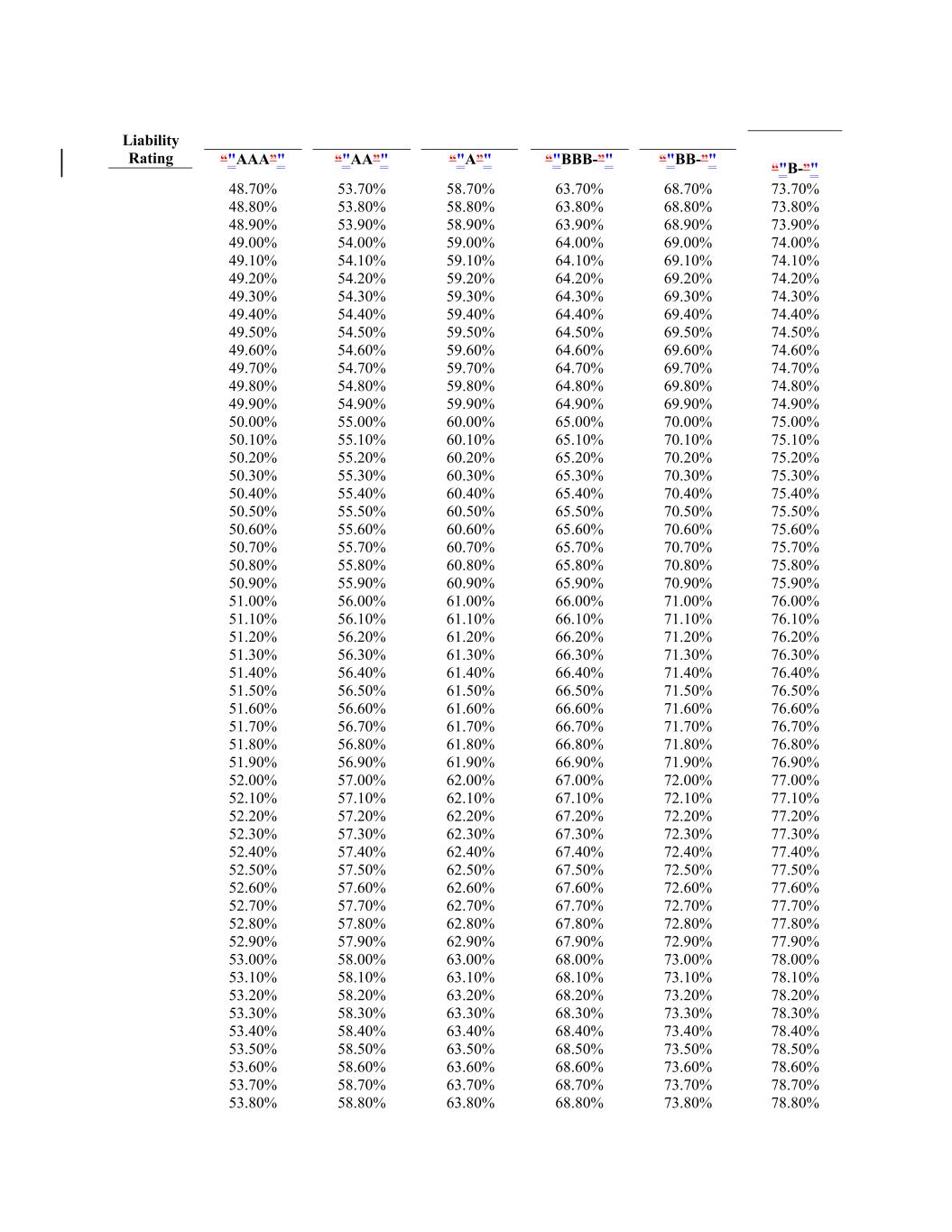 58.90% 64.40% 69.40% Liability Rating 74.40% 54.10% 79.40% 63.90% 59.10% “"BBB-”" 54.50% 64.10% 59.50% 68.90% 64.50% 69.10% 69.50% 74.50% 74.10% 79.50% 73.90% 79.10% “"BB-”" 54.60% 59.60% 78.90% 64.60% 69.60% “"AAA”" 74.60% 54.20% 79.60% 59.20% “"B-”" 54.70% 64.20% 59.70% 64.70% 69.20% 69.70% 74.70% 74.20% 79.70% 54.00% 79.20% 54.80% 59.80% 59.00% 64.80% 69.80% “"AA”" 74.80% 54.30% 79.80% 64.00% 59.30% 54.90% 64.30% 59.90% 69.00% 64.90% 69.30% 69.90% 74.90% 74.30% 79.90% 74.00% 79.30% 53.90% 55.00% 60.00% 79.00% 65.00% 70.00% “"A”" 75.00% 54.40% 80.00% 59.40%