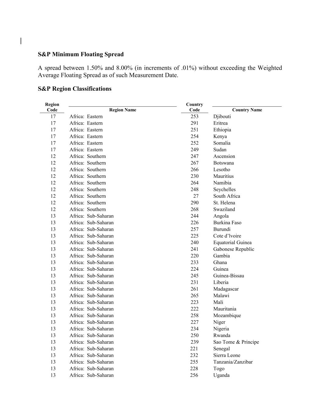 Lesotho Africa: Sub-Saharan 254 240 Equatorial Guinea 12 13 Kenya Africa: Sub-Saharan Africa: Southern 241 Gabonese Republic 230 13 Mauritius Africa: Sub-Saharan 17 220 Gambia 17 12 13 Country Name Africa: Sub-Saharan Africa: Southern 233 Africa: Eastern Ghana 264 Africa: Eastern 13 Namibia Africa: Sub-Saharan 252 224 Guinea 12 13 Somalia Africa: Sub-Saharan Africa: Southern 245 291 Guinea-Bissau 248 13 Seychelles Africa: Sub-Saharan 231 Liberia 17 12 13 Eritrea Africa: Sub-Saharan Africa: Southern 261 Africa: Eastern Madagascar 27 Region Code 13 South Africa Africa: Sub-Saharan 249 265 Malawi 12 13 Sudan Africa: Sub-Saharan Africa: Southern 223 17 Mali 290 13 St. Helena Africa: Sub-Saharan 17 222 Mauritania 12 12 13 Africa: Sub-Saharan Africa: Southern 258 Africa: Southern Mozambique 268 Africa: Eastern 13 Swaziland Africa: Sub-Saharan 247 227 Niger Africa: Eastern 13 13 Ascension Africa: Sub-Saharan Africa: Sub-Saharan 234 251 Nigeria 244 13 Angola Africa: Sub-Saharan Region Name 250 Rwanda 12 13 13 Ethiopia Africa: Sub-Saharan Africa: Sub-Saharan 239 Africa: Southern Sao Tome & Principe 226 253 13 Burkina Faso Africa: Sub-Saharan 267 221 Senegal 13 13 Botswana Africa: Sub-Saharan Africa: Sub-Saharan 232 S&P Minimum Floating Spread A spread between 1.50% and 8.00% (in increments of .01%) without exceeding the Weighted Average Floating Spread as of such Measurement Date. S&P Region Classifications Sierra Leone 257 13 Burundi Africa: Sub-Saharan 17 255 Tanzania/Zanzibar 12 13 13 Djibouti Africa: Sub-Saharan Africa: Sub-Saharan 228 Africa: Southern Togo 225 Africa: Eastern 13 Cote d’lvoire Africa: Sub-Saharan 266 256 Uganda Country Code 13