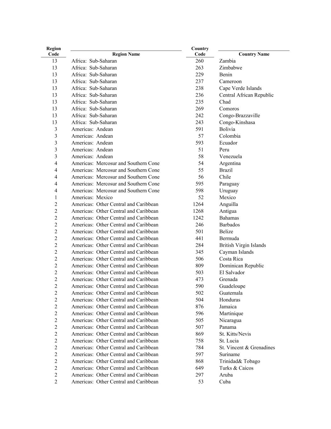 Americas: Other Central and Caribbean 1242 Cape Verde Islands Bahamas 3 2 Americas: Andean Americas: Other Central and Caribbean 246 57 Barbados Zimbabwe Colombia 2 13 Americas: Other Central and Caribbean 501 13 Belize 3 Africa: Sub-Saharan 2 Americas: Andean Americas: Other Central and Caribbean 441 593 Bermuda 236 Ecuador 2 Region Name Americas: Other Central and Caribbean 284 Central African Republic British Virgin Islands 3 13 2 Americas: Andean Americas: Other Central and Caribbean 345 51 Cayman Islands Africa: Sub-Saharan Peru 2 13 Americas: Other Central and Caribbean 506 Africa: Sub-Saharan Costa Rica 3 Africa: Sub-Saharan 2 Americas: Andean Americas: Other Central and Caribbean 809 58 Dominican Republic 235 Venezuela 2 229 Americas: Other Central and Caribbean 503 Chad El Salvador 4 260 2 Americas: Mercosur and Southern Cone Americas: Other Central and Caribbean 473 54 Grenada Benin Argentina 2 13 Americas: Other Central and Caribbean 590 Country Code Guadeloupe 4 Africa: Sub-Saharan 2 Americas: Mercosur and Southern Cone Americas: Other Central and Caribbean 502 55 Guatemala 269 Brazil 2 Zambia Americas: Other Central and Caribbean 504 Comoros Honduras 4 13 2 Americas: Mercosur and Southern Cone Americas: Other Central and Caribbean 876 56 Jamaica Chile 2 13 Americas: Other Central and Caribbean 596 Africa: Sub-Saharan Martinique 4 Africa: Sub-Saharan 2 Americas: Mercosur and Southern Cone Americas: Other Central and Caribbean 505 595 Nicaragua 242 Paraguay 2 237 Americas: Other Central and Caribbean 507 Congo-Brazzaville Panama 4 Country Name 2 Americas: Mercosur and Southern Cone Americas: Other Central and Caribbean 869 598 St. Kitts/Nevis Cameroon Uruguay 2 13 Americas: Other Central and Caribbean 758 13 St. Lucia 1 Africa: Sub-Saharan 2 Americas: Mexico Americas: Other Central and Caribbean 784 52 St. Vincent & Grenadines 243 Mexico 2 Region Code Americas: Other Central and Caribbean 597 Congo-Kinshasa Suriname 2 13 2 Americas: Other Central and Caribbean Americas: Other Central and Caribbean 868 1264 Trinidad& Tobago Africa: Sub-Saharan Anguilla 2 3 Americas: Other Central and Caribbean 649 Africa: Sub-Saharan Turks & Caicos 2 Americas: Andean 2 Americas: Other Central and Caribbean Americas: Other Central and Caribbean 297 1268 Aruba 591 Antigua 2 238 Americas: Other Central and Caribbean 53 Bolivia Cuba 2 263