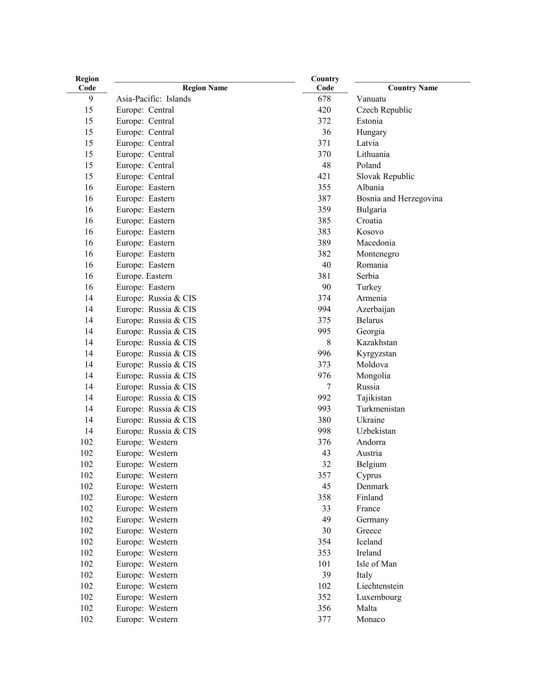 Europe: Russia & CIS 996 Latvia Kyrgyzstan 16 14 Europe: Eastern Europe: Russia & CIS 373 385 Moldova Czech Republic Croatia 14 15 Europe: Russia & CIS 976 9 Mongolia 16 Europe: Central 14 Europe: Eastern Europe: Russia & CIS 7 383 Russia 370 Kosovo 14 Region Name Europe: Russia & CIS 992 Lithuania Tajikistan 16 15 14 Europe: Eastern Europe: Russia & CIS 993 389 Turkmenistan Asia-Pacific: Islands Macedonia 14 15 Europe: Russia & CIS 380 Europe: Central Ukraine 16 Europe: Central 14 Europe: Eastern Europe: Russia & CIS 998 382 Uzbekistan 48 Montenegro 102 372 Europe: Western 376 Poland Andorra 16 678 102 Europe: Eastern Europe: Western 43 40 Austria Estonia Romania 102 15 Europe: Western 32 Country Code Belgium 16 Europe: Central 102 Europe. Eastern Europe: Western 357 381 Cyprus 421 Serbia 102 Vanuatu Europe: Western 45 Slovak Republic Denmark 16 15 102 Europe: Eastern Europe: Western 358 90 Finland Turkey 102 16 Europe: Western 33 Europe: Central France 14 Europe: Eastern 102 Europe: Russia & CIS Europe: Western 49 374 Germany 355 Armenia 102 36 Europe: Western 30 Albania Greece 14 Country Name 102 Europe: Russia & CIS Europe: Western 354 994 Iceland Hungary Azerbaijan 102 16 Europe: Western 353 15 Ireland 14 Europe: Eastern 102 Europe: Russia & CIS Europe: Western 101 375 Isle of Man 387 Belarus 102 Region Code Europe: Western 39 Bosnia and Herzegovina Italy 14 15 102 Europe: Russia & CIS Europe: Western 102 995 Liechtenstein Europe: Central Georgia 102 16 Europe: Western 352 Europe: Central Luxembourg 14 Europe: Eastern 102 Europe: Russia & CIS Europe: Western 356 8 Malta 359 Kazakhstan 102 371 Europe: Western 377 Bulgaria Monaco 14 420