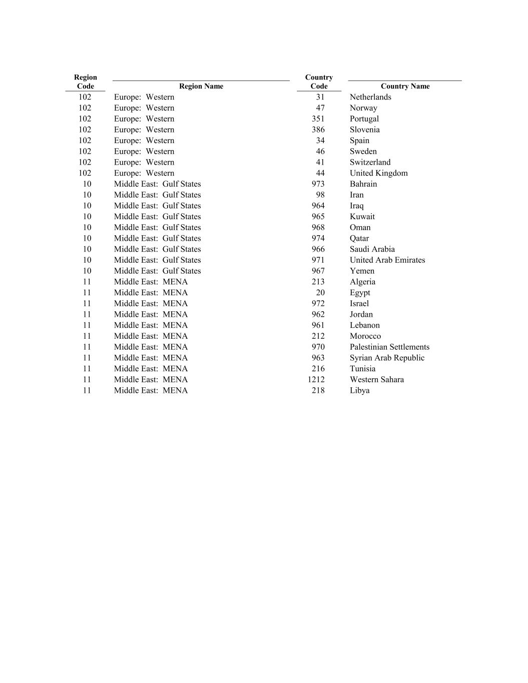 Middle East: Gulf States 974 Europe: Western Qatar 102 Europe: Western 10 Europe: Western Middle East: Gulf States 966 41 Saudi Arabia 351 Switzerland 10 31 Middle East: Gulf States 971 Portugal United Arab Emirates 102 Country Code 10 Europe: Western Middle East: Gulf States 967 44 Yemen Netherlands United Kingdom 11 102 Middle East: MENA 213 Algeria 10 Europe: Western 11 Middle East: Gulf States Middle East: MENA 20 973 Egypt 386 Bahrain 11 Country Name Middle East: MENA 972 Slovenia Israel 10 102 11 Middle East: Gulf States Middle East: MENA 962 98 Jordan Region Code Iran 11 102 Middle East: MENA 961 Europe: Western Lebanon 10 Europe: Western 11 Middle East: Gulf States Middle East: MENA 212 964 Morocco 34 Iraq 11 47 Middle East: MENA 970 Spain Palestinian Settlements 10 11 Middle East: Gulf States Middle East: MENA 963 965 Syrian Arab Republic Norway Kuwait 11 102 Middle East: MENA 216 102 Tunisia 10 Europe: Western 11 Middle East: Gulf States Middle East: MENA 1212 968 Western Sahara 46 Oman 11 Region Name Middle East: MENA 218 Sweden Libya 10 102