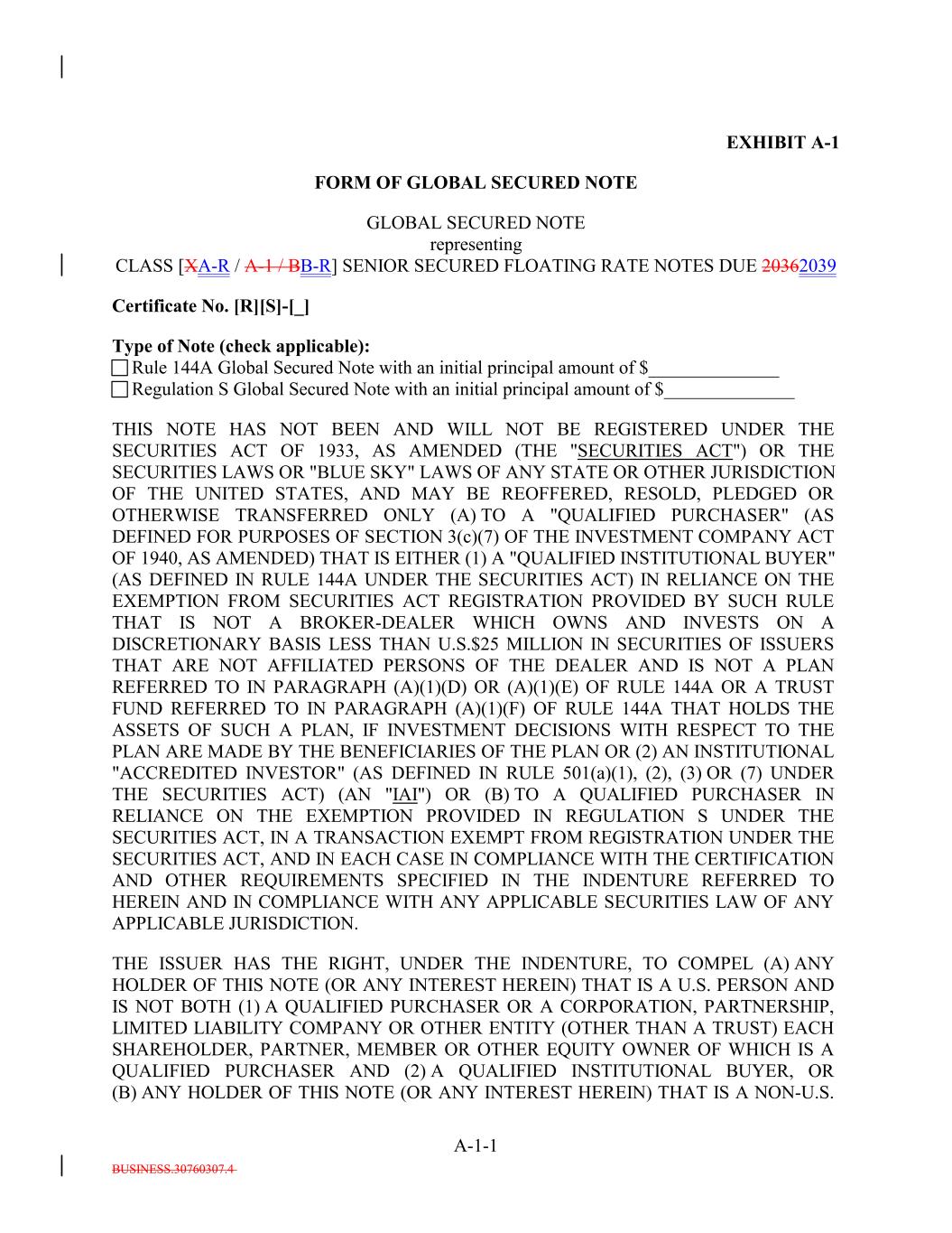 BUSINESS.30760307.4 A-1-1 EXHIBIT A-1 FORM OF GLOBAL SECURED NOTE GLOBAL SECURED NOTE representing CLASS [XA-R / A-1 / BB-R] SENIOR SECURED FLOATING RATE NOTES DUE 20362039 Certificate No. [R][S]-[_] Type of Note (check applicable): Rule 144A Global Secured Note with an initial principal amount of $______________ Regulation S Global Secured Note with an initial principal amount of $______________ THIS NOTE HAS NOT BEEN AND WILL NOT BE REGISTERED UNDER THE SECURITIES ACT OF 1933, AS AMENDED (THE "SECURITIES ACT") OR THE SECURITIES LAWS OR "BLUE SKY" LAWS OF ANY STATE OR OTHER JURISDICTION OF THE UNITED STATES, AND MAY BE REOFFERED, RESOLD, PLEDGED OR OTHERWISE TRANSFERRED ONLY (A) TO A "QUALIFIED PURCHASER" (AS DEFINED FOR PURPOSES OF SECTION 3(c)(7) OF THE INVESTMENT COMPANY ACT OF 1940, AS AMENDED) THAT IS EITHER (1) A "QUALIFIED INSTITUTIONAL BUYER" (AS DEFINED IN RULE 144A UNDER THE SECURITIES ACT) IN RELIANCE ON THE EXEMPTION FROM SECURITIES ACT REGISTRATION PROVIDED BY SUCH RULE THAT IS NOT A BROKER-DEALER WHICH OWNS AND INVESTS ON A DISCRETIONARY BASIS LESS THAN U.S.$25 MILLION IN SECURITIES OF ISSUERS THAT ARE NOT AFFILIATED PERSONS OF THE DEALER AND IS NOT A PLAN REFERRED TO IN PARAGRAPH (A)(1)(D) OR (A)(1)(E) OF RULE 144A OR A TRUST FUND REFERRED TO IN PARAGRAPH (A)(1)(F) OF RULE 144A THAT HOLDS THE ASSETS OF SUCH A PLAN, IF INVESTMENT DECISIONS WITH RESPECT TO THE PLAN ARE MADE BY THE BENEFICIARIES OF THE PLAN OR (2) AN INSTITUTIONAL "ACCREDITED INVESTOR" (AS DEFINED IN RULE 501(a)(1), (2), (3) OR (7) UNDER THE SECURITIES ACT) (AN "IAI") OR (B) TO A QUALIFIED PURCHASER IN RELIANCE ON THE EXEMPTION PROVIDED IN REGULATION S UNDER THE SECURITIES ACT, IN A TRANSACTION EXEMPT FROM REGISTRATION UNDER THE SECURITIES ACT, AND IN EACH CASE IN COMPLIANCE WITH THE CERTIFICATION AND OTHER REQUIREMENTS SPECIFIED IN THE INDENTURE REFERRED TO HEREIN AND IN COMPLIANCE WITH ANY APPLICABLE SECURITIES LAW OF ANY APPLICABLE JURISDICTION. THE ISSUER HAS THE RIGHT, UNDER THE INDENTURE, TO COMPEL (A) ANY HOLDER OF THIS NOTE (OR ANY INTEREST HEREIN) THAT IS A U.S. PERSON AND IS NOT BOTH (1) A QUALIFIED PURCHASER OR A CORPORATION, PARTNERSHIP, LIMITED LIABILITY COMPANY OR OTHER ENTITY (OTHER THAN A TRUST) EACH SHAREHOLDER, PARTNER, MEMBER OR OTHER EQUITY OWNER OF WHICH IS A QUALIFIED PURCHASER AND (2) A QUALIFIED INSTITUTIONAL BUYER, OR (B) ANY HOLDER OF THIS NOTE (OR ANY INTEREST HEREIN) THAT IS A NON-U.S.