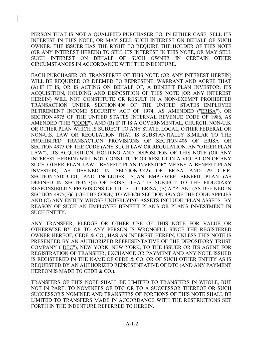PERSON THAT IS NOT A QUALIFIED PURCHASER TO, IN EITHER CASE, SELL ITS INTEREST IN THIS NOTE, OR MAY SELL SUCH INTEREST ON BEHALF OF SUCH OWNER. THE ISSUER HAS THE RIGHT TO REQUIRE THE HOLDER OF THIS NOTE (OR ANY INTEREST HEREIN) TO SELL ITS INTEREST IN THIS NOTE, OR MAY SELL SUCH INTEREST ON BEHALF OF SUCH OWNER IN CERTAIN OTHER CIRCUMSTANCES IN ACCORDANCE WITH THE INDENTURE. EACH PURCHASER OR TRANSFEREE OF THIS NOTE (OR ANY INTEREST HEREIN) WILL BE REQUIRED OR DEEMED TO REPRESENT, WARRANT AND AGREE THAT (A) IF IT IS, OR IS ACTING ON BEHALF OF, A BENEFIT PLAN INVESTOR, ITS ACQUISITION, HOLDING AND DISPOSITION OF THIS NOTE (OR ANY INTEREST HEREIN) WILL NOT CONSTITUTE OR RESULT IN A NON-EXEMPT PROHIBITED TRANSACTION UNDER SECTION 406 OF THE UNITED STATES EMPLOYEE RETIREMENT INCOME SECURITY ACT OF 1974, AS AMENDED ("ERISA"), OR SECTION 4975 OF THE UNITED STATES INTERNAL REVENUE CODE OF 1986, AS AMENDED (THE "CODE"), AND (B) IF IT IS A GOVERNMENTAL, CHURCH, NON-U.S. OR OTHER PLAN WHICH IS SUBJECT TO ANY STATE, LOCAL, OTHER FEDERAL OR NON-U.S. LAW OR REGULATION THAT IS SUBSTANTIALLY SIMILAR TO THE PROHIBITED TRANSACTION PROVISIONS OF SECTION 406 OF ERISA OR SECTION 4975 OF THE CODE (ANY SUCH LAW OR REGULATION, AN "OTHER PLAN LAW"), ITS ACQUISITION, HOLDING AND DISPOSITION OF THIS NOTE (OR ANY INTEREST HEREIN) WILL NOT CONSTITUTE OR RESULT IN A VIOLATION OF ANY SUCH OTHER PLAN LAW. "BENEFIT PLAN INVESTOR" MEANS A BENEFIT PLAN INVESTOR, AS DEFINED IN SECTION 3(42) OF ERISA AND 29 C.F.R. SECTION 2510.3-101, AND INCLUDES (A) AN EMPLOYEE BENEFIT PLAN (AS DEFINED IN SECTION 3(3) OF ERISA) THAT IS SUBJECT TO THE FIDUCIARY RESPONSIBILITY PROVISIONS OF TITLE I OF ERISA, (B) A "PLAN" (AS DEFINED IN SECTION 4975(E)(1) OF THE CODE) TO WHICH SECTION 4975 OF THE CODE APPLIES AND (C) ANY ENTITY WHOSE UNDERLYING ASSETS INCLUDE "PLAN ASSETS" BY REASON OF SUCH AN EMPLOYEE BENEFIT PLAN'S OR PLAN'S INVESTMENT IN SUCH ENTITY. ANY TRANSFER, PLEDGE OR OTHER USE OF THIS NOTE FOR VALUE OR OTHERWISE BY OR TO ANY PERSON IS WRONGFUL SINCE THE REGISTERED OWNER HEREOF, CEDE & CO., HAS AN INTEREST HEREIN, UNLESS THIS NOTE IS PRESENTED BY AN AUTHORIZED REPRESENTATIVE OF THE DEPOSITORY TRUST COMPANY ("DTC"), NEW YORK, NEW YORK, TO THE ISSUER OR ITS AGENT FOR REGISTRATION OF TRANSFER, EXCHANGE OR PAYMENT AND ANY NOTE ISSUED IS REGISTERED IN THE NAME OF CEDE & CO. OR OF SUCH OTHER ENTITY AS IS REQUESTED BY AN AUTHORIZED REPRESENTATIVE OF DTC (AND ANY PAYMENT HEREON IS MADE TO CEDE & CO.). TRANSFERS OF THIS NOTE SHALL BE LIMITED TO TRANSFERS IN WHOLE, BUT NOT IN PART, TO NOMINEES OF DTC OR TO A SUCCESSOR THEREOF OR SUCH SUCCESSOR'S NOMINEE AND TRANSFERS OF PORTIONS OF THIS NOTE SHALL BE LIMITED TO TRANSFERS MADE IN ACCORDANCE WITH THE RESTRICTIONS SET FORTH IN THE INDENTURE REFERRED TO HEREIN. A-1-2