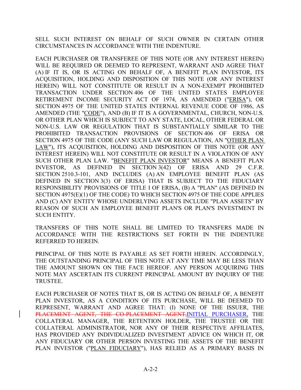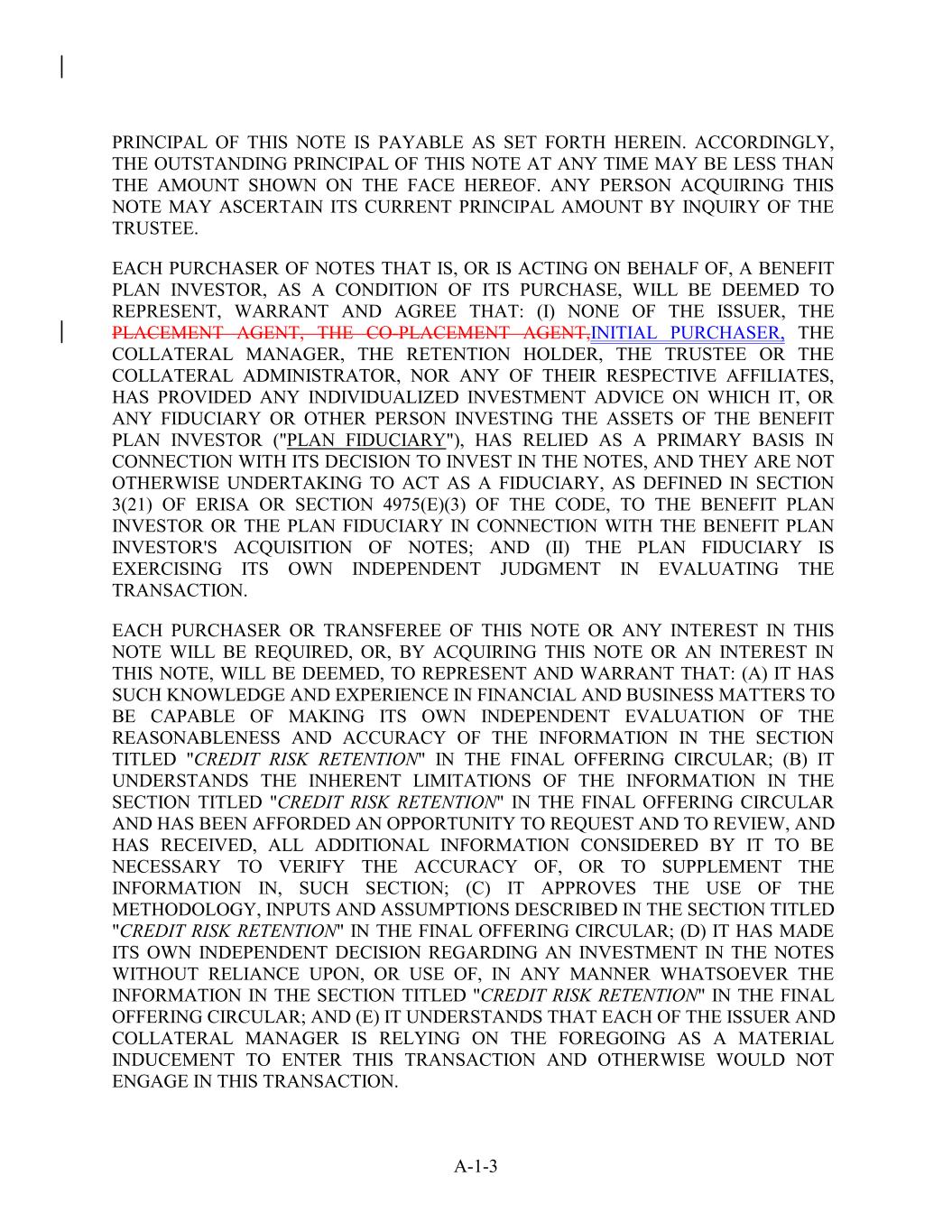 PRINCIPAL OF THIS NOTE IS PAYABLE AS SET FORTH HEREIN. ACCORDINGLY, THE OUTSTANDING PRINCIPAL OF THIS NOTE AT ANY TIME MAY BE LESS THAN THE AMOUNT SHOWN ON THE FACE HEREOF. ANY PERSON ACQUIRING THIS NOTE MAY ASCERTAIN ITS CURRENT PRINCIPAL AMOUNT BY INQUIRY OF THE TRUSTEE. EACH PURCHASER OF NOTES THAT IS, OR IS ACTING ON BEHALF OF, A BENEFIT PLAN INVESTOR, AS A CONDITION OF ITS PURCHASE, WILL BE DEEMED TO REPRESENT, WARRANT AND AGREE THAT: (I) NONE OF THE ISSUER, THE PLACEMENT AGENT, THE CO-PLACEMENT AGENT,INITIAL PURCHASER, THE COLLATERAL MANAGER, THE RETENTION HOLDER, THE TRUSTEE OR THE COLLATERAL ADMINISTRATOR, NOR ANY OF THEIR RESPECTIVE AFFILIATES, HAS PROVIDED ANY INDIVIDUALIZED INVESTMENT ADVICE ON WHICH IT, OR ANY FIDUCIARY OR OTHER PERSON INVESTING THE ASSETS OF THE BENEFIT PLAN INVESTOR ("PLAN FIDUCIARY"), HAS RELIED AS A PRIMARY BASIS IN CONNECTION WITH ITS DECISION TO INVEST IN THE NOTES, AND THEY ARE NOT OTHERWISE UNDERTAKING TO ACT AS A FIDUCIARY, AS DEFINED IN SECTION 3(21) OF ERISA OR SECTION 4975(E)(3) OF THE CODE, TO THE BENEFIT PLAN INVESTOR OR THE PLAN FIDUCIARY IN CONNECTION WITH THE BENEFIT PLAN INVESTOR'S ACQUISITION OF NOTES; AND (II) THE PLAN FIDUCIARY IS EXERCISING ITS OWN INDEPENDENT JUDGMENT IN EVALUATING THE TRANSACTION. EACH PURCHASER OR TRANSFEREE OF THIS NOTE OR ANY INTEREST IN THIS NOTE WILL BE REQUIRED, OR, BY ACQUIRING THIS NOTE OR AN INTEREST IN THIS NOTE, WILL BE DEEMED, TO REPRESENT AND WARRANT THAT: (A) IT HAS SUCH KNOWLEDGE AND EXPERIENCE IN FINANCIAL AND BUSINESS MATTERS TO BE CAPABLE OF MAKING ITS OWN INDEPENDENT EVALUATION OF THE REASONABLENESS AND ACCURACY OF THE INFORMATION IN THE SECTION TITLED "CREDIT RISK RETENTION" IN THE FINAL OFFERING CIRCULAR; (B) IT UNDERSTANDS THE INHERENT LIMITATIONS OF THE INFORMATION IN THE SECTION TITLED "CREDIT RISK RETENTION" IN THE FINAL OFFERING CIRCULAR AND HAS BEEN AFFORDED AN OPPORTUNITY TO REQUEST AND TO REVIEW, AND HAS RECEIVED, ALL ADDITIONAL INFORMATION CONSIDERED BY IT TO BE NECESSARY TO VERIFY THE ACCURACY OF, OR TO SUPPLEMENT THE INFORMATION IN, SUCH SECTION; (C) IT APPROVES THE USE OF THE METHODOLOGY, INPUTS AND ASSUMPTIONS DESCRIBED IN THE SECTION TITLED "CREDIT RISK RETENTION" IN THE FINAL OFFERING CIRCULAR; (D) IT HAS MADE ITS OWN INDEPENDENT DECISION REGARDING AN INVESTMENT IN THE NOTES WITHOUT RELIANCE UPON, OR USE OF, IN ANY MANNER WHATSOEVER THE INFORMATION IN THE SECTION TITLED "CREDIT RISK RETENTION" IN THE FINAL OFFERING CIRCULAR; AND (E) IT UNDERSTANDS THAT EACH OF THE ISSUER AND COLLATERAL MANAGER IS RELYING ON THE FOREGOING AS A MATERIAL INDUCEMENT TO ENTER THIS TRANSACTION AND OTHERWISE WOULD NOT ENGAGE IN THIS TRANSACTION. A-1-3