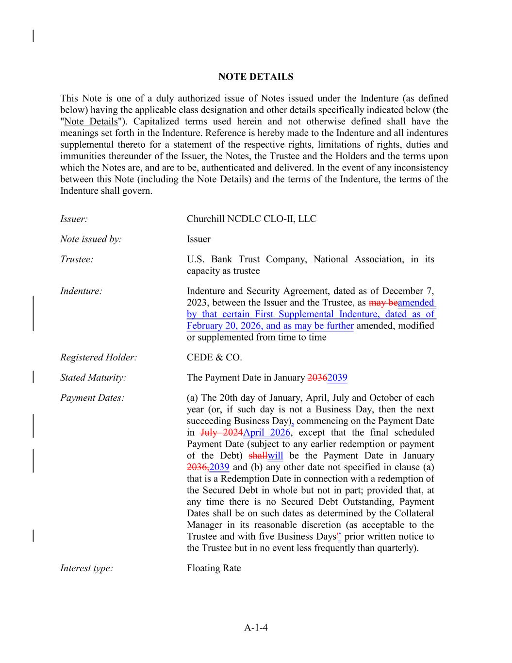 A-1-4 Indenture and Security Agreement, dated as of December 7, 2023, between the Issuer and the Trustee, as may beamended by that certain First Supplemental Indenture, dated as of February 20, 2026, and as may be further amended, modified or supplemented from time to time Note issued by: Registered Holder: CEDE & CO. Issuer Stated Maturity: The Payment Date in January 20362039 Issuer: Trustee: Payment Dates: (a) The 20th day of January, April, July and October of each year (or, if such day is not a Business Day, then the next succeeding Business Day), commencing on the Payment Date in July 2024April 2026, except that the final scheduled Payment Date (subject to any earlier redemption or payment of the Debt) shallwill be the Payment Date in January 2036,2039 and (b) any other date not specified in clause (a) that is a Redemption Date in connection with a redemption of the Secured Debt in whole but not in part; provided that, at any time there is no Secured Debt Outstanding, Payment Dates shall be on such dates as determined by the Collateral Manager in its reasonable discretion (as acceptable to the Trustee and with five Business Days'’ prior written notice to the Trustee but in no event less frequently than quarterly). U.S. Bank Trust Company, National Association, in its capacity as trustee Churchill NCDLC CLO-II, LLC Interest type: Floating Rate NOTE DETAILS This Note is one of a duly authorized issue of Notes issued under the Indenture (as defined below) having the applicable class designation and other details specifically indicated below (the "Note Details"). Capitalized terms used herein and not otherwise defined shall have the meanings set forth in the Indenture. Reference is hereby made to the Indenture and all indentures supplemental thereto for a statement of the respective rights, limitations of rights, duties and immunities thereunder of the Issuer, the Notes, the Trustee and the Holders and the terms upon which the Notes are, and are to be, authenticated and delivered. In the event of any inconsistency between this Note (including the Note Details) and the terms of the Indenture, the terms of the Indenture shall govern. Indenture: