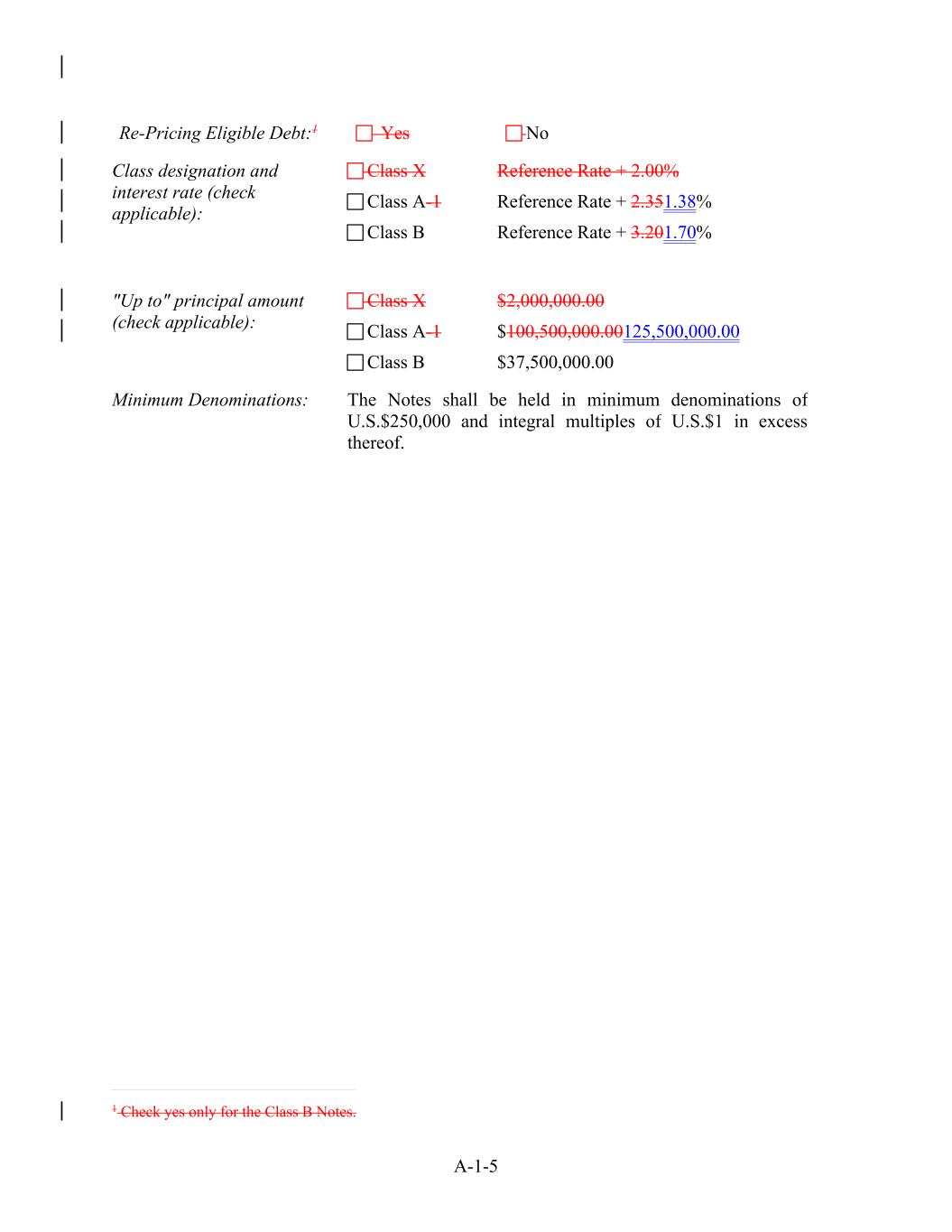 A-1-5 Yes No "Up to" principal amount (check applicable): Class X $2,000,000.00 Class A-1 $100,500,000.00125,500,000.00 Class B $37,500,000.00 Minimum Denominations: Class designation and interest rate (check applicable): The Notes shall be held in minimum denominations of U.S.$250,000 and integral multiples of U.S.$1 in excess thereof. Re-Pricing Eligible Debt:1 Class X Reference Rate + 2.00% Class A-1 Reference Rate + 2.351.38% Class B Reference Rate + 3.201.70% 1 Check yes only for the Class B Notes.