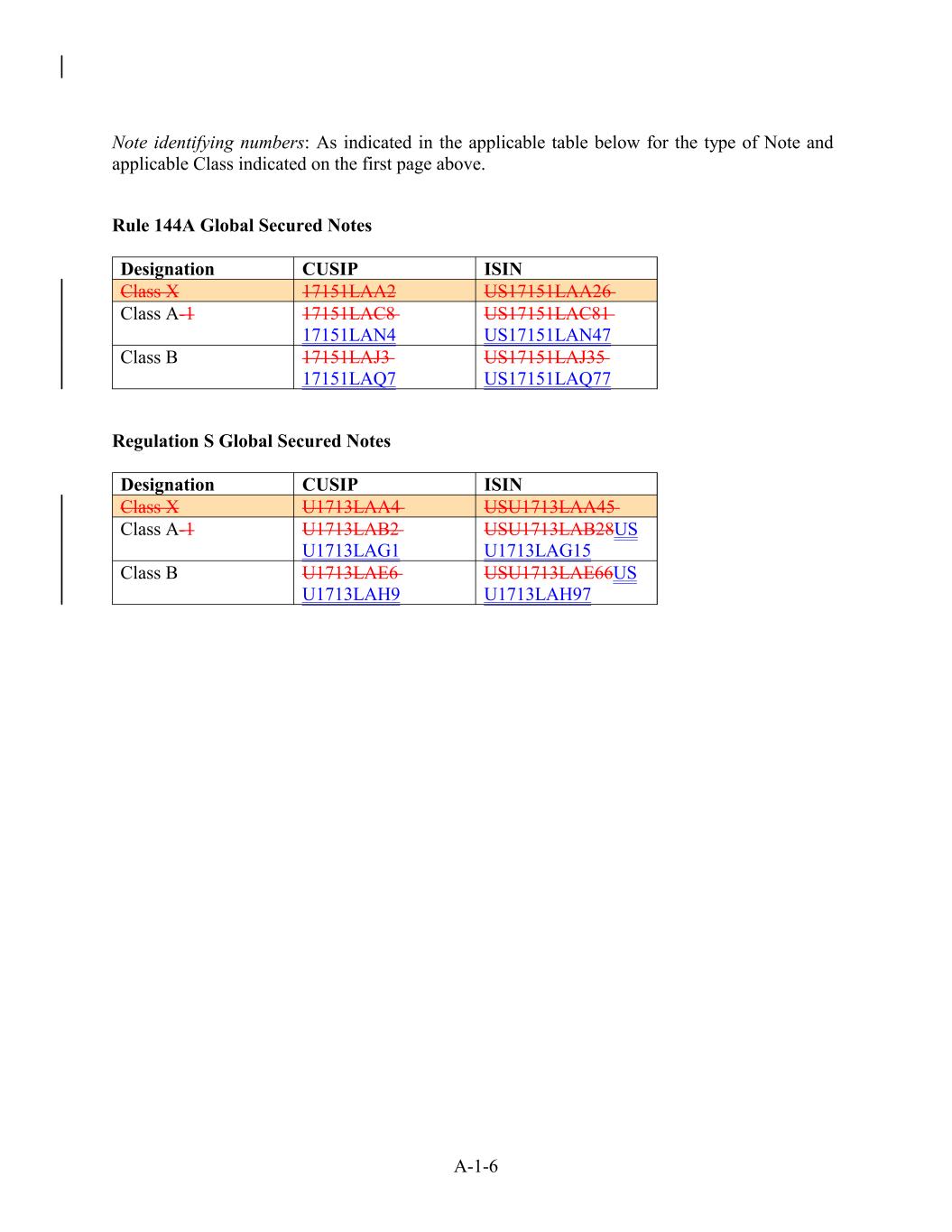 A-1-6 US17151LAJ35 US17151LAQ77 17151LAA2 Regulation S Global Secured Notes Designation US17151LAA26 CUSIP CUSIP ISIN Note identifying numbers: As indicated in the applicable table below for the type of Note and applicable Class indicated on the first page above. Rule 144A Global Secured Notes Class X Class A-1 U1713LAA4 ISIN USU1713LAA45 17151LAC8 17151LAN4 Class A-1 US17151LAC81 US17151LAN47 U1713LAB2 U1713LAG1 USU1713LAB28US U1713LAG15 Class B Class B U1713LAE6 U1713LAH9 Class X USU1713LAE66US U1713LAH97 17151LAJ3 17151LAQ7 Designation