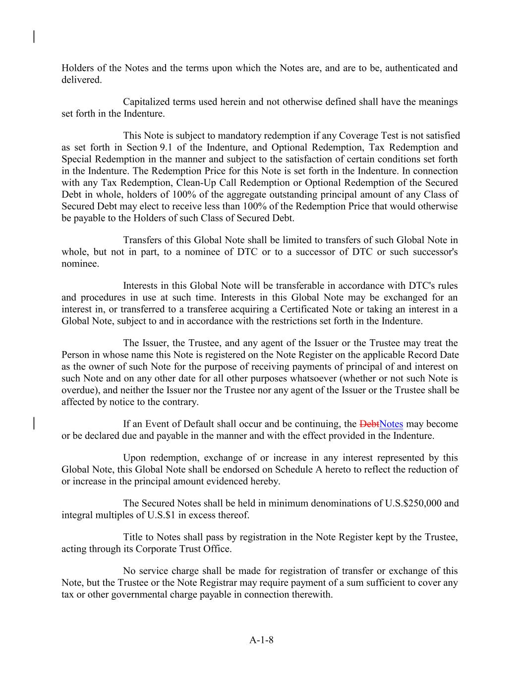 Holders of the Notes and the terms upon which the Notes are, and are to be, authenticated and delivered. Capitalized terms used herein and not otherwise defined shall have the meanings set forth in the Indenture. This Note is subject to mandatory redemption if any Coverage Test is not satisfied as set forth in Section 9.1 of the Indenture, and Optional Redemption, Tax Redemption and Special Redemption in the manner and subject to the satisfaction of certain conditions set forth in the Indenture. The Redemption Price for this Note is set forth in the Indenture. In connection with any Tax Redemption, Clean-Up Call Redemption or Optional Redemption of the Secured Debt in whole, holders of 100% of the aggregate outstanding principal amount of any Class of Secured Debt may elect to receive less than 100% of the Redemption Price that would otherwise be payable to the Holders of such Class of Secured Debt. Transfers of this Global Note shall be limited to transfers of such Global Note in whole, but not in part, to a nominee of DTC or to a successor of DTC or such successor's nominee. Interests in this Global Note will be transferable in accordance with DTC's rules and procedures in use at such time. Interests in this Global Note may be exchanged for an interest in, or transferred to a transferee acquiring a Certificated Note or taking an interest in a Global Note, subject to and in accordance with the restrictions set forth in the Indenture. The Issuer, the Trustee, and any agent of the Issuer or the Trustee may treat the Person in whose name this Note is registered on the Note Register on the applicable Record Date as the owner of such Note for the purpose of receiving payments of principal of and interest on such Note and on any other date for all other purposes whatsoever (whether or not such Note is overdue), and neither the Issuer nor the Trustee nor any agent of the Issuer or the Trustee shall be affected by notice to the contrary. If an Event of Default shall occur and be continuing, the DebtNotes may become or be declared due and payable in the manner and with the effect provided in the Indenture. Upon redemption, exchange of or increase in any interest represented by this Global Note, this Global Note shall be endorsed on Schedule A hereto to reflect the reduction of or increase in the principal amount evidenced hereby. The Secured Notes shall be held in minimum denominations of U.S.$250,000 and integral multiples of U.S.$1 in excess thereof. Title to Notes shall pass by registration in the Note Register kept by the Trustee, acting through its Corporate Trust Office. No service charge shall be made for registration of transfer or exchange of this Note, but the Trustee or the Note Registrar may require payment of a sum sufficient to cover any tax or other governmental charge payable in connection therewith. A-1-8