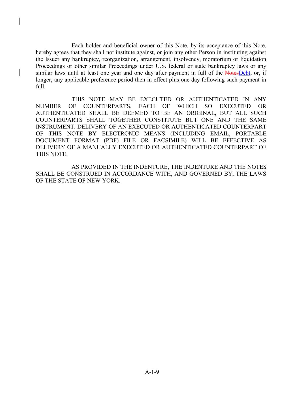 Each holder and beneficial owner of this Note, by its acceptance of this Note, hereby agrees that they shall not institute against, or join any other Person in instituting against the Issuer any bankruptcy, reorganization, arrangement, insolvency, moratorium or liquidation Proceedings or other similar Proceedings under U.S. federal or state bankruptcy laws or any similar laws until at least one year and one day after payment in full of the NotesDebt, or, if longer, any applicable preference period then in effect plus one day following such payment in full. THIS NOTE MAY BE EXECUTED OR AUTHENTICATED IN ANY NUMBER OF COUNTERPARTS, EACH OF WHICH SO EXECUTED OR AUTHENTICATED SHALL BE DEEMED TO BE AN ORIGINAL, BUT ALL SUCH COUNTERPARTS SHALL TOGETHER CONSTITUTE BUT ONE AND THE SAME INSTRUMENT. DELIVERY OF AN EXECUTED OR AUTHENTICATED COUNTERPART OF THIS NOTE BY ELECTRONIC MEANS (INCLUDING EMAIL, PORTABLE DOCUMENT FORMAT (PDF) FILE OR FACSIMILE) WILL BE EFFECTIVE AS DELIVERY OF A MANUALLY EXECUTED OR AUTHENTICATED COUNTERPART OF THIS NOTE. AS PROVIDED IN THE INDENTURE, THE INDENTURE AND THE NOTES SHALL BE CONSTRUED IN ACCORDANCE WITH, AND GOVERNED BY, THE LAWS OF THE STATE OF NEW YORK. A-1-9