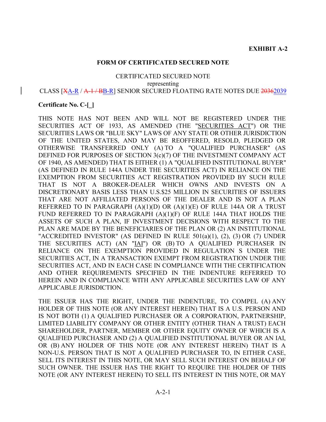 EXHIBIT A-2 FORM OF CERTIFICATED SECURED NOTE CERTIFICATED SECURED NOTE representing CLASS [XA-R / A-1 / BB-R] SENIOR SECURED FLOATING RATE NOTES DUE 20362039 Certificate No. C-[_] THIS NOTE HAS NOT BEEN AND WILL NOT BE REGISTERED UNDER THE SECURITIES ACT OF 1933, AS AMENDED (THE "SECURITIES ACT") OR THE SECURITIES LAWS OR "BLUE SKY" LAWS OF ANY STATE OR OTHER JURISDICTION OF THE UNITED STATES, AND MAY BE REOFFERED, RESOLD, PLEDGED OR OTHERWISE TRANSFERRED ONLY (A) TO A "QUALIFIED PURCHASER" (AS DEFINED FOR PURPOSES OF SECTION 3(c)(7) OF THE INVESTMENT COMPANY ACT OF 1940, AS AMENDED) THAT IS EITHER (1) A "QUALIFIED INSTITUTIONAL BUYER" (AS DEFINED IN RULE 144A UNDER THE SECURITIES ACT) IN RELIANCE ON THE EXEMPTION FROM SECURITIES ACT REGISTRATION PROVIDED BY SUCH RULE THAT IS NOT A BROKER-DEALER WHICH OWNS AND INVESTS ON A DISCRETIONARY BASIS LESS THAN U.S.$25 MILLION IN SECURITIES OF ISSUERS THAT ARE NOT AFFILIATED PERSONS OF THE DEALER AND IS NOT A PLAN REFERRED TO IN PARAGRAPH (A)(1)(D) OR (A)(1)(E) OF RULE 144A OR A TRUST FUND REFERRED TO IN PARAGRAPH (A)(1)(F) OF RULE 144A THAT HOLDS THE ASSETS OF SUCH A PLAN, IF INVESTMENT DECISIONS WITH RESPECT TO THE PLAN ARE MADE BY THE BENEFICIARIES OF THE PLAN OR (2) AN INSTITUTIONAL "ACCREDITED INVESTOR" (AS DEFINED IN RULE 501(a)(1), (2), (3) OR (7) UNDER THE SECURITIES ACT) (AN "IAI") OR (B) TO A QUALIFIED PURCHASER IN RELIANCE ON THE EXEMPTION PROVIDED IN REGULATION S UNDER THE SECURITIES ACT, IN A TRANSACTION EXEMPT FROM REGISTRATION UNDER THE SECURITIES ACT, AND IN EACH CASE IN COMPLIANCE WITH THE CERTIFICATION AND OTHER REQUIREMENTS SPECIFIED IN THE INDENTURE REFERRED TO HEREIN AND IN COMPLIANCE WITH ANY APPLICABLE SECURITIES LAW OF ANY APPLICABLE JURISDICTION. THE ISSUER HAS THE RIGHT, UNDER THE INDENTURE, TO COMPEL (A) ANY HOLDER OF THIS NOTE (OR ANY INTEREST HEREIN) THAT IS A U.S. PERSON AND IS NOT BOTH (1) A QUALIFIED PURCHASER OR A CORPORATION, PARTNERSHIP, LIMITED LIABILITY COMPANY OR OTHER ENTITY (OTHER THAN A TRUST) EACH SHAREHOLDER, PARTNER, MEMBER OR OTHER EQUITY OWNER OF WHICH IS A QUALIFIED PURCHASER AND (2) A QUALIFIED INSTITUTIONAL BUYER OR AN IAI, OR (B) ANY HOLDER OF THIS NOTE (OR ANY INTEREST HEREIN) THAT IS A NON-U.S. PERSON THAT IS NOT A QUALIFIED PURCHASER TO, IN EITHER CASE, SELL ITS INTEREST IN THIS NOTE, OR MAY SELL SUCH INTEREST ON BEHALF OF SUCH OWNER. THE ISSUER HAS THE RIGHT TO REQUIRE THE HOLDER OF THIS NOTE (OR ANY INTEREST HEREIN) TO SELL ITS INTEREST IN THIS NOTE, OR MAY A-2-1