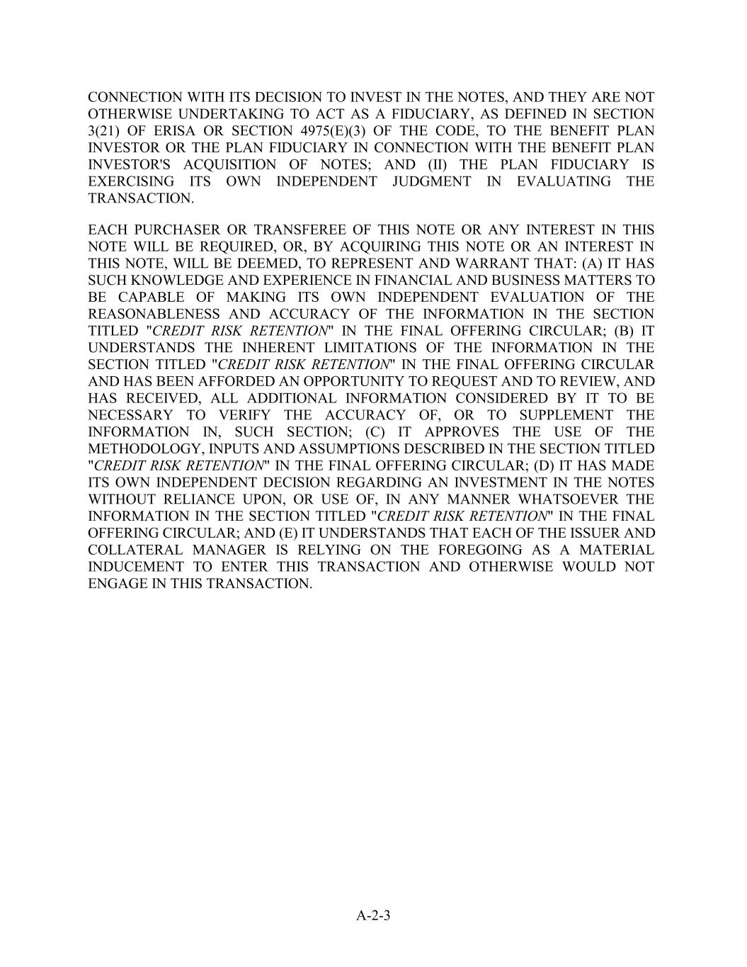 CONNECTION WITH ITS DECISION TO INVEST IN THE NOTES, AND THEY ARE NOT OTHERWISE UNDERTAKING TO ACT AS A FIDUCIARY, AS DEFINED IN SECTION 3(21) OF ERISA OR SECTION 4975(E)(3) OF THE CODE, TO THE BENEFIT PLAN INVESTOR OR THE PLAN FIDUCIARY IN CONNECTION WITH THE BENEFIT PLAN INVESTOR'S ACQUISITION OF NOTES; AND (II) THE PLAN FIDUCIARY IS EXERCISING ITS OWN INDEPENDENT JUDGMENT IN EVALUATING THE TRANSACTION. EACH PURCHASER OR TRANSFEREE OF THIS NOTE OR ANY INTEREST IN THIS NOTE WILL BE REQUIRED, OR, BY ACQUIRING THIS NOTE OR AN INTEREST IN THIS NOTE, WILL BE DEEMED, TO REPRESENT AND WARRANT THAT: (A) IT HAS SUCH KNOWLEDGE AND EXPERIENCE IN FINANCIAL AND BUSINESS MATTERS TO BE CAPABLE OF MAKING ITS OWN INDEPENDENT EVALUATION OF THE REASONABLENESS AND ACCURACY OF THE INFORMATION IN THE SECTION TITLED "CREDIT RISK RETENTION" IN THE FINAL OFFERING CIRCULAR; (B) IT UNDERSTANDS THE INHERENT LIMITATIONS OF THE INFORMATION IN THE SECTION TITLED "CREDIT RISK RETENTION" IN THE FINAL OFFERING CIRCULAR AND HAS BEEN AFFORDED AN OPPORTUNITY TO REQUEST AND TO REVIEW, AND HAS RECEIVED, ALL ADDITIONAL INFORMATION CONSIDERED BY IT TO BE NECESSARY TO VERIFY THE ACCURACY OF, OR TO SUPPLEMENT THE INFORMATION IN, SUCH SECTION; (C) IT APPROVES THE USE OF THE METHODOLOGY, INPUTS AND ASSUMPTIONS DESCRIBED IN THE SECTION TITLED "CREDIT RISK RETENTION" IN THE FINAL OFFERING CIRCULAR; (D) IT HAS MADE ITS OWN INDEPENDENT DECISION REGARDING AN INVESTMENT IN THE NOTES WITHOUT RELIANCE UPON, OR USE OF, IN ANY MANNER WHATSOEVER THE INFORMATION IN THE SECTION TITLED "CREDIT RISK RETENTION" IN THE FINAL OFFERING CIRCULAR; AND (E) IT UNDERSTANDS THAT EACH OF THE ISSUER AND COLLATERAL MANAGER IS RELYING ON THE FOREGOING AS A MATERIAL INDUCEMENT TO ENTER THIS TRANSACTION AND OTHERWISE WOULD NOT ENGAGE IN THIS TRANSACTION. A-2-3