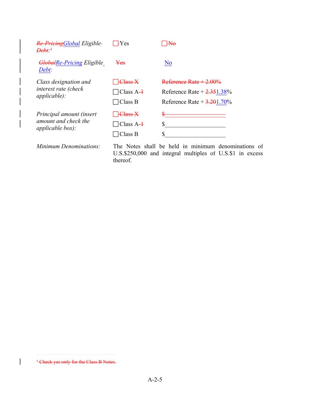 A-2-5 Class X Reference Rate + 2.00% Class A-1 Reference Rate + 2.351.38% Class B Reference Rate + 3.201.70% Principal amount (insert amount and check the applicable box): GlobalRe-Pricing Eligible Debt: Class X $____________________ Class A-1 $____________________ Class B $____________________ Re-PricingGlobal Eligible Debt:1 Yes No Minimum Denominations: The Notes shall be held in minimum denominations of U.S.$250,000 and integral multiples of U.S.$1 in excess thereof. Yes No Class designation and interest rate (check applicable): 1 Check yes only for the Class B Notes.