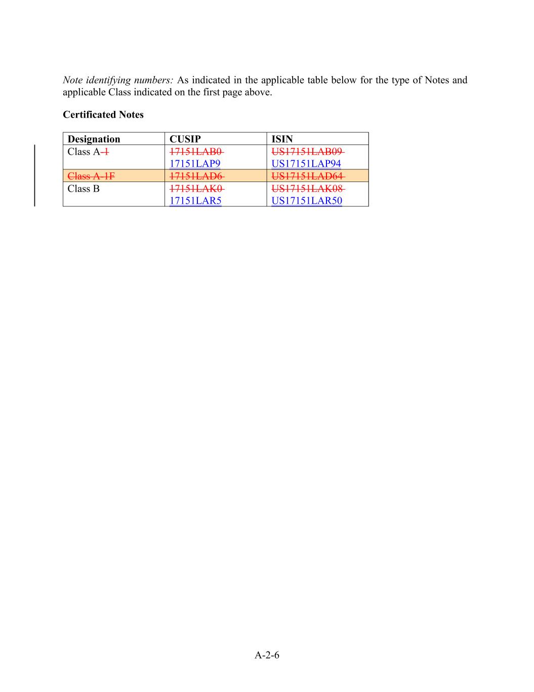 A-2-6 US17151LAB09 US17151LAP94 CUSIP Note identifying numbers: As indicated in the applicable table below for the type of Notes and applicable Class indicated on the first page above. Certificated Notes Class A-1F ISIN 17151LAD6 US17151LAD64 Class B Class A-1 17151LAK0 17151LAR5 Designation US17151LAK08 US17151LAR50 17151LAB0 17151LAP9