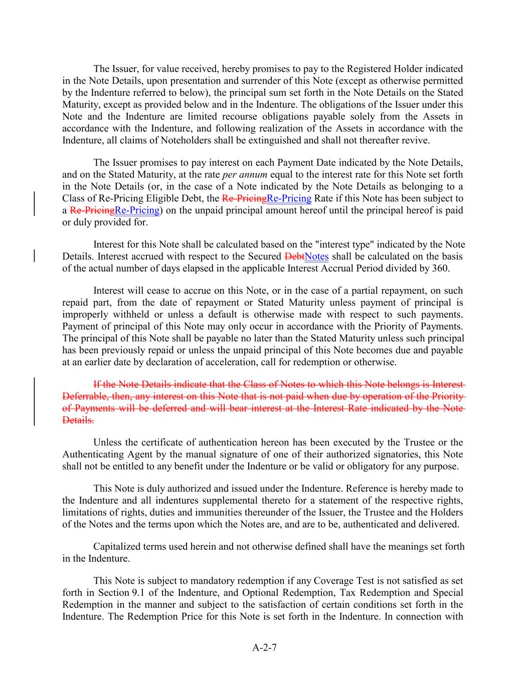 The Issuer, for value received, hereby promises to pay to the Registered Holder indicated in the Note Details, upon presentation and surrender of this Note (except as otherwise permitted by the Indenture referred to below), the principal sum set forth in the Note Details on the Stated Maturity, except as provided below and in the Indenture. The obligations of the Issuer under this Note and the Indenture are limited recourse obligations payable solely from the Assets in accordance with the Indenture, and following realization of the Assets in accordance with the Indenture, all claims of Noteholders shall be extinguished and shall not thereafter revive. The Issuer promises to pay interest on each Payment Date indicated by the Note Details, and on the Stated Maturity, at the rate per annum equal to the interest rate for this Note set forth in the Note Details (or, in the case of a Note indicated by the Note Details as belonging to a Class of Re-Pricing Eligible Debt, the Re-PricingRe-Pricing Rate if this Note has been subject to a Re-PricingRe-Pricing) on the unpaid principal amount hereof until the principal hereof is paid or duly provided for. Interest for this Note shall be calculated based on the "interest type" indicated by the Note Details. Interest accrued with respect to the Secured DebtNotes shall be calculated on the basis of the actual number of days elapsed in the applicable Interest Accrual Period divided by 360. Interest will cease to accrue on this Note, or in the case of a partial repayment, on such repaid part, from the date of repayment or Stated Maturity unless payment of principal is improperly withheld or unless a default is otherwise made with respect to such payments. Payment of principal of this Note may only occur in accordance with the Priority of Payments. The principal of this Note shall be payable no later than the Stated Maturity unless such principal has been previously repaid or unless the unpaid principal of this Note becomes due and payable at an earlier date by declaration of acceleration, call for redemption or otherwise. If the Note Details indicate that the Class of Notes to which this Note belongs is Interest Deferrable, then, any interest on this Note that is not paid when due by operation of the Priority of Payments will be deferred and will bear interest at the Interest Rate indicated by the Note Details. Unless the certificate of authentication hereon has been executed by the Trustee or the Authenticating Agent by the manual signature of one of their authorized signatories, this Note shall not be entitled to any benefit under the Indenture or be valid or obligatory for any purpose. This Note is duly authorized and issued under the Indenture. Reference is hereby made to the Indenture and all indentures supplemental thereto for a statement of the respective rights, limitations of rights, duties and immunities thereunder of the Issuer, the Trustee and the Holders of the Notes and the terms upon which the Notes are, and are to be, authenticated and delivered. Capitalized terms used herein and not otherwise defined shall have the meanings set forth in the Indenture. This Note is subject to mandatory redemption if any Coverage Test is not satisfied as set forth in Section 9.1 of the Indenture, and Optional Redemption, Tax Redemption and Special Redemption in the manner and subject to the satisfaction of certain conditions set forth in the Indenture. The Redemption Price for this Note is set forth in the Indenture. In connection with A-2-7