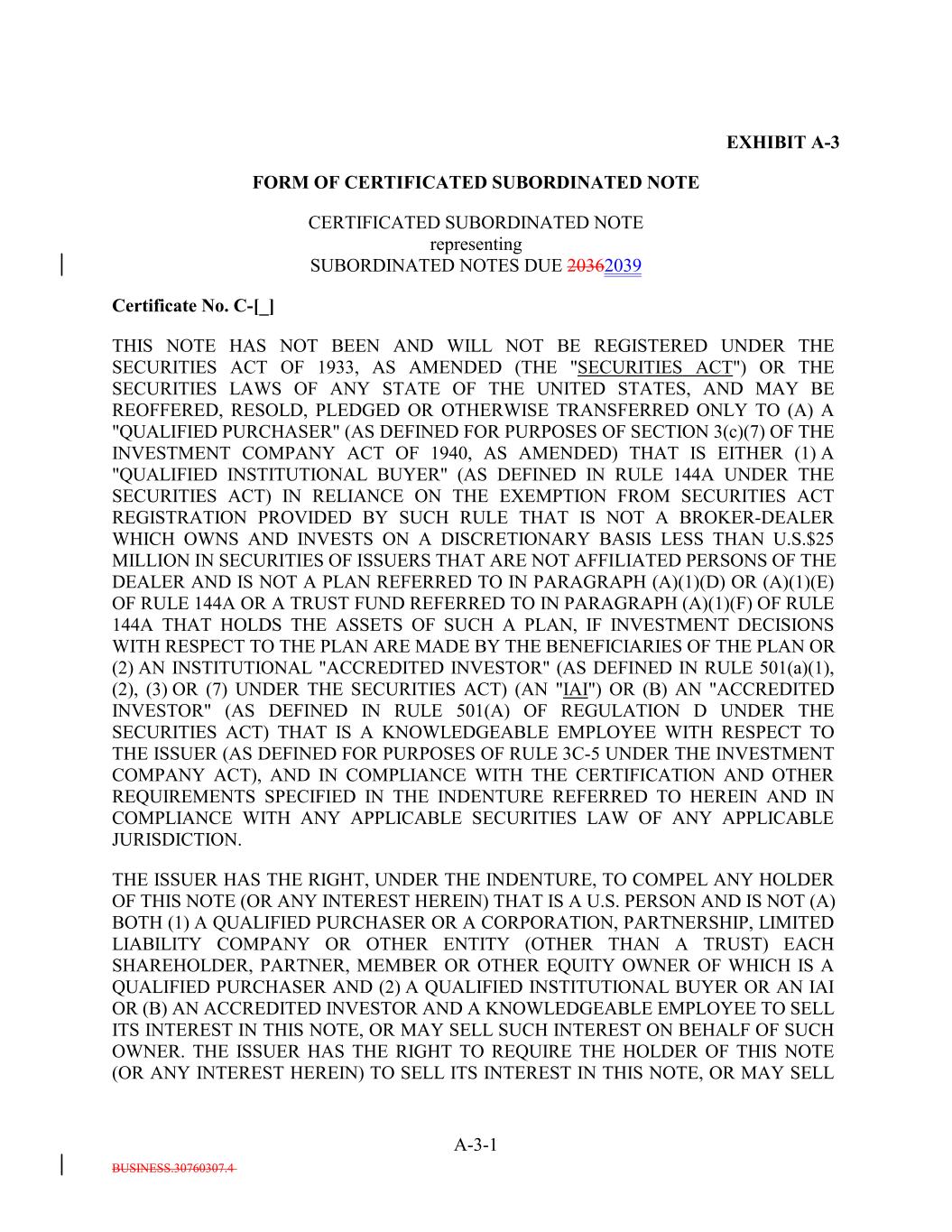 BUSINESS.30760307.4 A-3-1 EXHIBIT A-3 FORM OF CERTIFICATED SUBORDINATED NOTE CERTIFICATED SUBORDINATED NOTE representing SUBORDINATED NOTES DUE 20362039 Certificate No. C-[_] THIS NOTE HAS NOT BEEN AND WILL NOT BE REGISTERED UNDER THE SECURITIES ACT OF 1933, AS AMENDED (THE "SECURITIES ACT") OR THE SECURITIES LAWS OF ANY STATE OF THE UNITED STATES, AND MAY BE REOFFERED, RESOLD, PLEDGED OR OTHERWISE TRANSFERRED ONLY TO (A) A "QUALIFIED PURCHASER" (AS DEFINED FOR PURPOSES OF SECTION 3(c)(7) OF THE INVESTMENT COMPANY ACT OF 1940, AS AMENDED) THAT IS EITHER (1) A "QUALIFIED INSTITUTIONAL BUYER" (AS DEFINED IN RULE 144A UNDER THE SECURITIES ACT) IN RELIANCE ON THE EXEMPTION FROM SECURITIES ACT REGISTRATION PROVIDED BY SUCH RULE THAT IS NOT A BROKER-DEALER WHICH OWNS AND INVESTS ON A DISCRETIONARY BASIS LESS THAN U.S.$25 MILLION IN SECURITIES OF ISSUERS THAT ARE NOT AFFILIATED PERSONS OF THE DEALER AND IS NOT A PLAN REFERRED TO IN PARAGRAPH (A)(1)(D) OR (A)(1)(E) OF RULE 144A OR A TRUST FUND REFERRED TO IN PARAGRAPH (A)(1)(F) OF RULE 144A THAT HOLDS THE ASSETS OF SUCH A PLAN, IF INVESTMENT DECISIONS WITH RESPECT TO THE PLAN ARE MADE BY THE BENEFICIARIES OF THE PLAN OR (2) AN INSTITUTIONAL "ACCREDITED INVESTOR" (AS DEFINED IN RULE 501(a)(1), (2), (3) OR (7) UNDER THE SECURITIES ACT) (AN "IAI") OR (B) AN "ACCREDITED INVESTOR" (AS DEFINED IN RULE 501(A) OF REGULATION D UNDER THE SECURITIES ACT) THAT IS A KNOWLEDGEABLE EMPLOYEE WITH RESPECT TO THE ISSUER (AS DEFINED FOR PURPOSES OF RULE 3C-5 UNDER THE INVESTMENT COMPANY ACT), AND IN COMPLIANCE WITH THE CERTIFICATION AND OTHER REQUIREMENTS SPECIFIED IN THE INDENTURE REFERRED TO HEREIN AND IN COMPLIANCE WITH ANY APPLICABLE SECURITIES LAW OF ANY APPLICABLE JURISDICTION. THE ISSUER HAS THE RIGHT, UNDER THE INDENTURE, TO COMPEL ANY HOLDER OF THIS NOTE (OR ANY INTEREST HEREIN) THAT IS A U.S. PERSON AND IS NOT (A) BOTH (1) A QUALIFIED PURCHASER OR A CORPORATION, PARTNERSHIP, LIMITED LIABILITY COMPANY OR OTHER ENTITY (OTHER THAN A TRUST) EACH SHAREHOLDER, PARTNER, MEMBER OR OTHER EQUITY OWNER OF WHICH IS A QUALIFIED PURCHASER AND (2) A QUALIFIED INSTITUTIONAL BUYER OR AN IAI OR (B) AN ACCREDITED INVESTOR AND A KNOWLEDGEABLE EMPLOYEE TO SELL ITS INTEREST IN THIS NOTE, OR MAY SELL SUCH INTEREST ON BEHALF OF SUCH OWNER. THE ISSUER HAS THE RIGHT TO REQUIRE THE HOLDER OF THIS NOTE (OR ANY INTEREST HEREIN) TO SELL ITS INTEREST IN THIS NOTE, OR MAY SELL