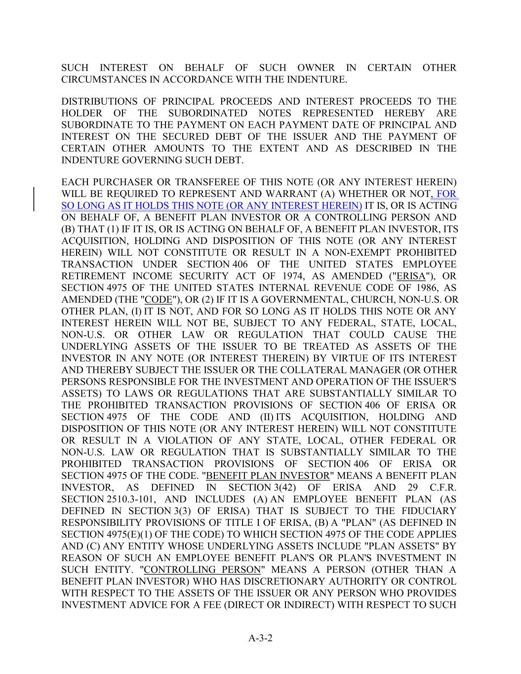 SUCH INTEREST ON BEHALF OF SUCH OWNER IN CERTAIN OTHER CIRCUMSTANCES IN ACCORDANCE WITH THE INDENTURE. DISTRIBUTIONS OF PRINCIPAL PROCEEDS AND INTEREST PROCEEDS TO THE HOLDER OF THE SUBORDINATED NOTES REPRESENTED HEREBY ARE SUBORDINATE TO THE PAYMENT ON EACH PAYMENT DATE OF PRINCIPAL AND INTEREST ON THE SECURED DEBT OF THE ISSUER AND THE PAYMENT OF CERTAIN OTHER AMOUNTS TO THE EXTENT AND AS DESCRIBED IN THE INDENTURE GOVERNING SUCH DEBT. EACH PURCHASER OR TRANSFEREE OF THIS NOTE (OR ANY INTEREST HEREIN) WILL BE REQUIRED TO REPRESENT AND WARRANT (A) WHETHER OR NOT, FOR SO LONG AS IT HOLDS THIS NOTE (OR ANY INTEREST HEREIN) IT IS, OR IS ACTING ON BEHALF OF, A BENEFIT PLAN INVESTOR OR A CONTROLLING PERSON AND (B) THAT (1) IF IT IS, OR IS ACTING ON BEHALF OF, A BENEFIT PLAN INVESTOR, ITS ACQUISITION, HOLDING AND DISPOSITION OF THIS NOTE (OR ANY INTEREST HEREIN) WILL NOT CONSTITUTE OR RESULT IN A NON-EXEMPT PROHIBITED TRANSACTION UNDER SECTION 406 OF THE UNITED STATES EMPLOYEE RETIREMENT INCOME SECURITY ACT OF 1974, AS AMENDED ("ERISA"), OR SECTION 4975 OF THE UNITED STATES INTERNAL REVENUE CODE OF 1986, AS AMENDED (THE "CODE"), OR (2) IF IT IS A GOVERNMENTAL, CHURCH, NON-U.S. OR OTHER PLAN, (I) IT IS NOT, AND FOR SO LONG AS IT HOLDS THIS NOTE OR ANY INTEREST HEREIN WILL NOT BE, SUBJECT TO ANY FEDERAL, STATE, LOCAL, NON-U.S. OR OTHER LAW OR REGULATION THAT COULD CAUSE THE UNDERLYING ASSETS OF THE ISSUER TO BE TREATED AS ASSETS OF THE INVESTOR IN ANY NOTE (OR INTEREST THEREIN) BY VIRTUE OF ITS INTEREST AND THEREBY SUBJECT THE ISSUER OR THE COLLATERAL MANAGER (OR OTHER PERSONS RESPONSIBLE FOR THE INVESTMENT AND OPERATION OF THE ISSUER'S ASSETS) TO LAWS OR REGULATIONS THAT ARE SUBSTANTIALLY SIMILAR TO THE PROHIBITED TRANSACTION PROVISIONS OF SECTION 406 OF ERISA OR SECTION 4975 OF THE CODE AND (II) ITS ACQUISITION, HOLDING AND DISPOSITION OF THIS NOTE (OR ANY INTEREST HEREIN) WILL NOT CONSTITUTE OR RESULT IN A VIOLATION OF ANY STATE, LOCAL, OTHER FEDERAL OR NON-U.S. LAW OR REGULATION THAT IS SUBSTANTIALLY SIMILAR TO THE PROHIBITED TRANSACTION PROVISIONS OF SECTION 406 OF ERISA OR SECTION 4975 OF THE CODE. "BENEFIT PLAN INVESTOR" MEANS A BENEFIT PLAN INVESTOR, AS DEFINED IN SECTION 3(42) OF ERISA AND 29 C.F.R. SECTION 2510.3-101, AND INCLUDES (A) AN EMPLOYEE BENEFIT PLAN (AS DEFINED IN SECTION 3(3) OF ERISA) THAT IS SUBJECT TO THE FIDUCIARY RESPONSIBILITY PROVISIONS OF TITLE I OF ERISA, (B) A "PLAN" (AS DEFINED IN SECTION 4975(E)(1) OF THE CODE) TO WHICH SECTION 4975 OF THE CODE APPLIES AND (C) ANY ENTITY WHOSE UNDERLYING ASSETS INCLUDE "PLAN ASSETS" BY REASON OF SUCH AN EMPLOYEE BENEFIT PLAN'S OR PLAN'S INVESTMENT IN SUCH ENTITY. "CONTROLLING PERSON" MEANS A PERSON (OTHER THAN A BENEFIT PLAN INVESTOR) WHO HAS DISCRETIONARY AUTHORITY OR CONTROL WITH RESPECT TO THE ASSETS OF THE ISSUER OR ANY PERSON WHO PROVIDES INVESTMENT ADVICE FOR A FEE (DIRECT OR INDIRECT) WITH RESPECT TO SUCH A-3-2