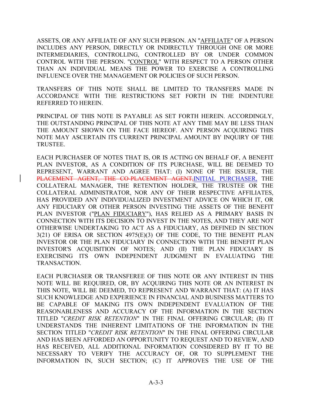 ASSETS, OR ANY AFFILIATE OF ANY SUCH PERSON. AN "AFFILIATE" OF A PERSON INCLUDES ANY PERSON, DIRECTLY OR INDIRECTLY THROUGH ONE OR MORE INTERMEDIARIES, CONTROLLING, CONTROLLED BY OR UNDER COMMON CONTROL WITH THE PERSON. "CONTROL" WITH RESPECT TO A PERSON OTHER THAN AN INDIVIDUAL MEANS THE POWER TO EXERCISE A CONTROLLING INFLUENCE OVER THE MANAGEMENT OR POLICIES OF SUCH PERSON. TRANSFERS OF THIS NOTE SHALL BE LIMITED TO TRANSFERS MADE IN ACCORDANCE WITH THE RESTRICTIONS SET FORTH IN THE INDENTURE REFERRED TO HEREIN. PRINCIPAL OF THIS NOTE IS PAYABLE AS SET FORTH HEREIN. ACCORDINGLY, THE OUTSTANDING PRINCIPAL OF THIS NOTE AT ANY TIME MAY BE LESS THAN THE AMOUNT SHOWN ON THE FACE HEREOF. ANY PERSON ACQUIRING THIS NOTE MAY ASCERTAIN ITS CURRENT PRINCIPAL AMOUNT BY INQUIRY OF THE TRUSTEE. EACH PURCHASER OF NOTES THAT IS, OR IS ACTING ON BEHALF OF, A BENEFIT PLAN INVESTOR, AS A CONDITION OF ITS PURCHASE, WILL BE DEEMED TO REPRESENT, WARRANT AND AGREE THAT: (I) NONE OF THE ISSUER, THE PLACEMENT AGENT, THE CO-PLACEMENT AGENT,INITIAL PURCHASER, THE COLLATERAL MANAGER, THE RETENTION HOLDER, THE TRUSTEE OR THE COLLATERAL ADMINISTRATOR, NOR ANY OF THEIR RESPECTIVE AFFILIATES, HAS PROVIDED ANY INDIVIDUALIZED INVESTMENT ADVICE ON WHICH IT, OR ANY FIDUCIARY OR OTHER PERSON INVESTING THE ASSETS OF THE BENEFIT PLAN INVESTOR ("PLAN FIDUCIARY"), HAS RELIED AS A PRIMARY BASIS IN CONNECTION WITH ITS DECISION TO INVEST IN THE NOTES, AND THEY ARE NOT OTHERWISE UNDERTAKING TO ACT AS A FIDUCIARY, AS DEFINED IN SECTION 3(21) OF ERISA OR SECTION 4975(E)(3) OF THE CODE, TO THE BENEFIT PLAN INVESTOR OR THE PLAN FIDUCIARY IN CONNECTION WITH THE BENEFIT PLAN INVESTOR'S ACQUISITION OF NOTES; AND (II) THE PLAN FIDUCIARY IS EXERCISING ITS OWN INDEPENDENT JUDGMENT IN EVALUATING THE TRANSACTION. EACH PURCHASER OR TRANSFEREE OF THIS NOTE OR ANY INTEREST IN THIS NOTE WILL BE REQUIRED, OR, BY ACQUIRING THIS NOTE OR AN INTEREST IN THIS NOTE, WILL BE DEEMED, TO REPRESENT AND WARRANT THAT: (A) IT HAS SUCH KNOWLEDGE AND EXPERIENCE IN FINANCIAL AND BUSINESS MATTERS TO BE CAPABLE OF MAKING ITS OWN INDEPENDENT EVALUATION OF THE REASONABLENESS AND ACCURACY OF THE INFORMATION IN THE SECTION TITLED "CREDIT RISK RETENTION" IN THE FINAL OFFERING CIRCULAR; (B) IT UNDERSTANDS THE INHERENT LIMITATIONS OF THE INFORMATION IN THE SECTION TITLED "CREDIT RISK RETENTION" IN THE FINAL OFFERING CIRCULAR AND HAS BEEN AFFORDED AN OPPORTUNITY TO REQUEST AND TO REVIEW, AND HAS RECEIVED, ALL ADDITIONAL INFORMATION CONSIDERED BY IT TO BE NECESSARY TO VERIFY THE ACCURACY OF, OR TO SUPPLEMENT THE INFORMATION IN, SUCH SECTION; (C) IT APPROVES THE USE OF THE A-3-3