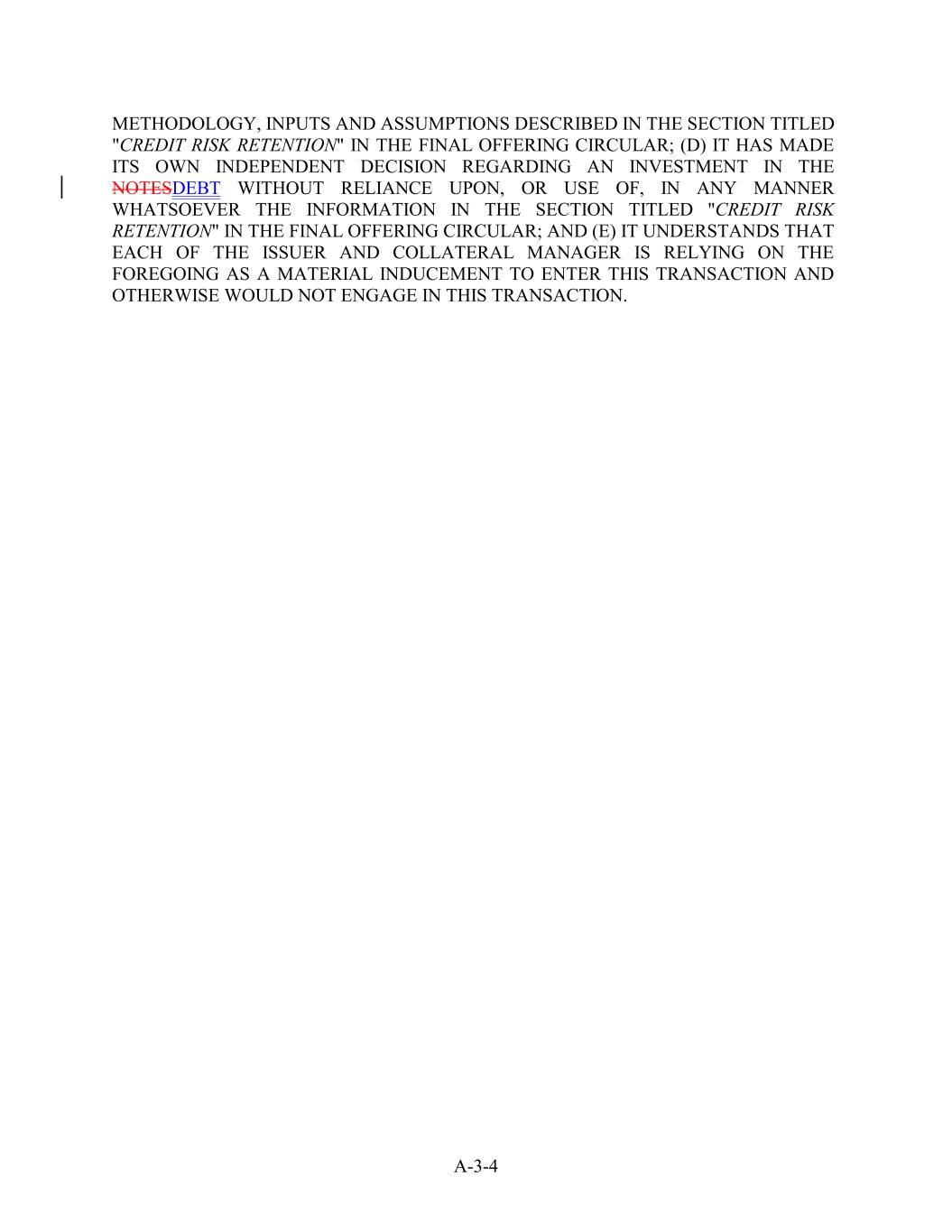 METHODOLOGY, INPUTS AND ASSUMPTIONS DESCRIBED IN THE SECTION TITLED "CREDIT RISK RETENTION" IN THE FINAL OFFERING CIRCULAR; (D) IT HAS MADE ITS OWN INDEPENDENT DECISION REGARDING AN INVESTMENT IN THE NOTESDEBT WITHOUT RELIANCE UPON, OR USE OF, IN ANY MANNER WHATSOEVER THE INFORMATION IN THE SECTION TITLED "CREDIT RISK RETENTION" IN THE FINAL OFFERING CIRCULAR; AND (E) IT UNDERSTANDS THAT EACH OF THE ISSUER AND COLLATERAL MANAGER IS RELYING ON THE FOREGOING AS A MATERIAL INDUCEMENT TO ENTER THIS TRANSACTION AND OTHERWISE WOULD NOT ENGAGE IN THIS TRANSACTION. A-3-4