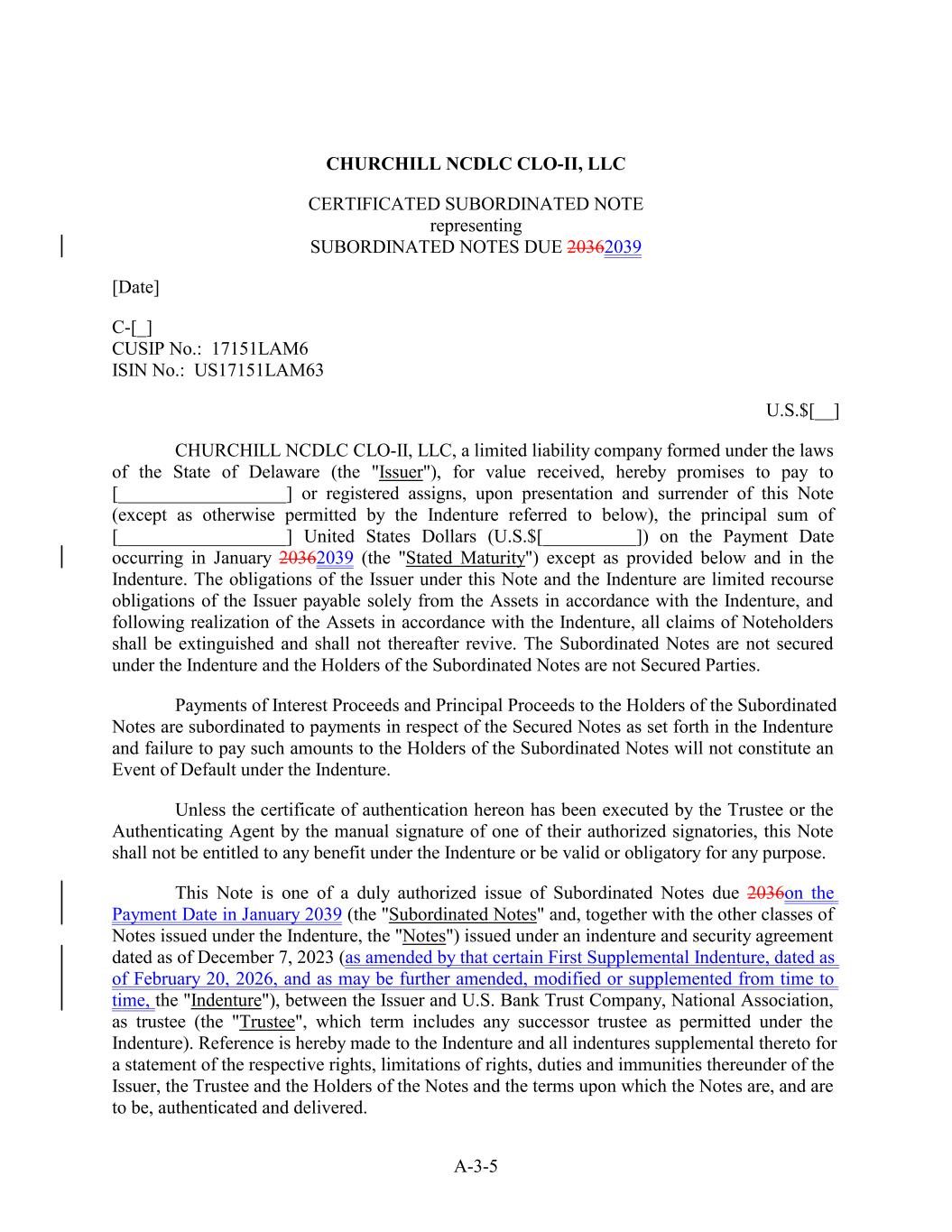 CHURCHILL NCDLC CLO-II, LLC CERTIFICATED SUBORDINATED NOTE representing SUBORDINATED NOTES DUE 20362039 [Date] C-[_] CUSIP No.: 17151LAM6 ISIN No.: US17151LAM63 U.S.$[__] CHURCHILL NCDLC CLO-II, LLC, a limited liability company formed under the laws of the State of Delaware (the "Issuer"), for value received, hereby promises to pay to [__________________] or registered assigns, upon presentation and surrender of this Note (except as otherwise permitted by the Indenture referred to below), the principal sum of [__________________] United States Dollars (U.S.$[__________]) on the Payment Date occurring in January 20362039 (the "Stated Maturity") except as provided below and in the Indenture. The obligations of the Issuer under this Note and the Indenture are limited recourse obligations of the Issuer payable solely from the Assets in accordance with the Indenture, and following realization of the Assets in accordance with the Indenture, all claims of Noteholders shall be extinguished and shall not thereafter revive. The Subordinated Notes are not secured under the Indenture and the Holders of the Subordinated Notes are not Secured Parties. Payments of Interest Proceeds and Principal Proceeds to the Holders of the Subordinated Notes are subordinated to payments in respect of the Secured Notes as set forth in the Indenture and failure to pay such amounts to the Holders of the Subordinated Notes will not constitute an Event of Default under the Indenture. Unless the certificate of authentication hereon has been executed by the Trustee or the Authenticating Agent by the manual signature of one of their authorized signatories, this Note shall not be entitled to any benefit under the Indenture or be valid or obligatory for any purpose. This Note is one of a duly authorized issue of Subordinated Notes due 2036on the Payment Date in January 2039 (the "Subordinated Notes" and, together with the other classes of Notes issued under the Indenture, the "Notes") issued under an indenture and security agreement dated as of December 7, 2023 (as amended by that certain First Supplemental Indenture, dated as of February 20, 2026, and as may be further amended, modified or supplemented from time to time, the "Indenture"), between the Issuer and U.S. Bank Trust Company, National Association, as trustee (the "Trustee", which term includes any successor trustee as permitted under the Indenture). Reference is hereby made to the Indenture and all indentures supplemental thereto for a statement of the respective rights, limitations of rights, duties and immunities thereunder of the Issuer, the Trustee and the Holders of the Notes and the terms upon which the Notes are, and are to be, authenticated and delivered. A-3-5