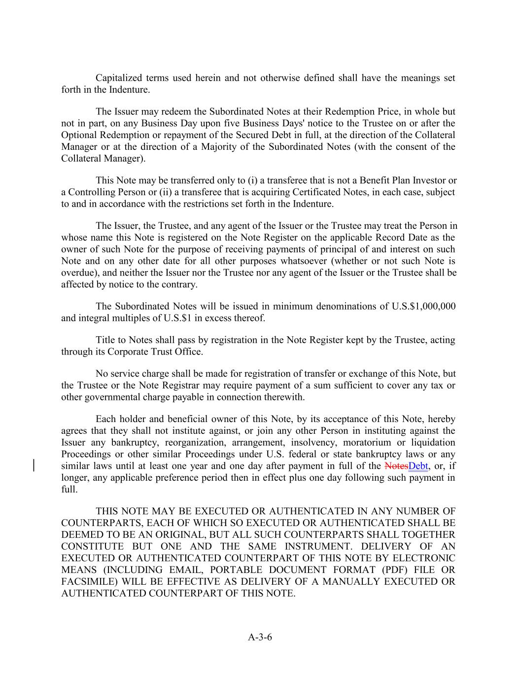 Capitalized terms used herein and not otherwise defined shall have the meanings set forth in the Indenture. The Issuer may redeem the Subordinated Notes at their Redemption Price, in whole but not in part, on any Business Day upon five Business Days' notice to the Trustee on or after the Optional Redemption or repayment of the Secured Debt in full, at the direction of the Collateral Manager or at the direction of a Majority of the Subordinated Notes (with the consent of the Collateral Manager). This Note may be transferred only to (i) a transferee that is not a Benefit Plan Investor or a Controlling Person or (ii) a transferee that is acquiring Certificated Notes, in each case, subject to and in accordance with the restrictions set forth in the Indenture. The Issuer, the Trustee, and any agent of the Issuer or the Trustee may treat the Person in whose name this Note is registered on the Note Register on the applicable Record Date as the owner of such Note for the purpose of receiving payments of principal of and interest on such Note and on any other date for all other purposes whatsoever (whether or not such Note is overdue), and neither the Issuer nor the Trustee nor any agent of the Issuer or the Trustee shall be affected by notice to the contrary. The Subordinated Notes will be issued in minimum denominations of U.S.$1,000,000 and integral multiples of U.S.$1 in excess thereof. Title to Notes shall pass by registration in the Note Register kept by the Trustee, acting through its Corporate Trust Office. No service charge shall be made for registration of transfer or exchange of this Note, but the Trustee or the Note Registrar may require payment of a sum sufficient to cover any tax or other governmental charge payable in connection therewith. Each holder and beneficial owner of this Note, by its acceptance of this Note, hereby agrees that they shall not institute against, or join any other Person in instituting against the Issuer any bankruptcy, reorganization, arrangement, insolvency, moratorium or liquidation Proceedings or other similar Proceedings under U.S. federal or state bankruptcy laws or any similar laws until at least one year and one day after payment in full of the NotesDebt, or, if longer, any applicable preference period then in effect plus one day following such payment in full. THIS NOTE MAY BE EXECUTED OR AUTHENTICATED IN ANY NUMBER OF COUNTERPARTS, EACH OF WHICH SO EXECUTED OR AUTHENTICATED SHALL BE DEEMED TO BE AN ORIGINAL, BUT ALL SUCH COUNTERPARTS SHALL TOGETHER CONSTITUTE BUT ONE AND THE SAME INSTRUMENT. DELIVERY OF AN EXECUTED OR AUTHENTICATED COUNTERPART OF THIS NOTE BY ELECTRONIC MEANS (INCLUDING EMAIL, PORTABLE DOCUMENT FORMAT (PDF) FILE OR FACSIMILE) WILL BE EFFECTIVE AS DELIVERY OF A MANUALLY EXECUTED OR AUTHENTICATED COUNTERPART OF THIS NOTE. A-3-6