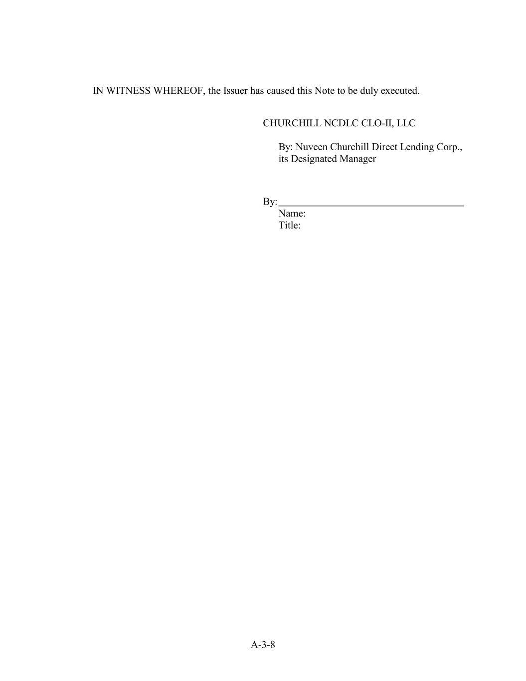 IN WITNESS WHEREOF, the Issuer has caused this Note to be duly executed. CHURCHILL NCDLC CLO-II, LLC By: Nuveen Churchill Direct Lending Corp., its Designated Manager By: Name: Title: A-3-8