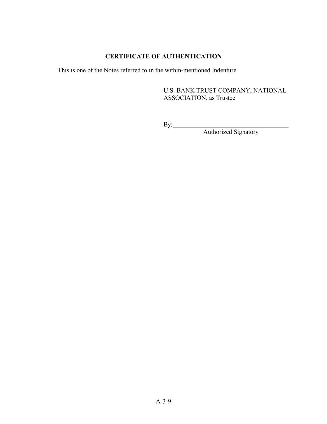 CERTIFICATE OF AUTHENTICATION This is one of the Notes referred to in the within-mentioned Indenture. U.S. BANK TRUST COMPANY, NATIONAL ASSOCIATION, as Trustee By: Authorized Signatory A-3-9