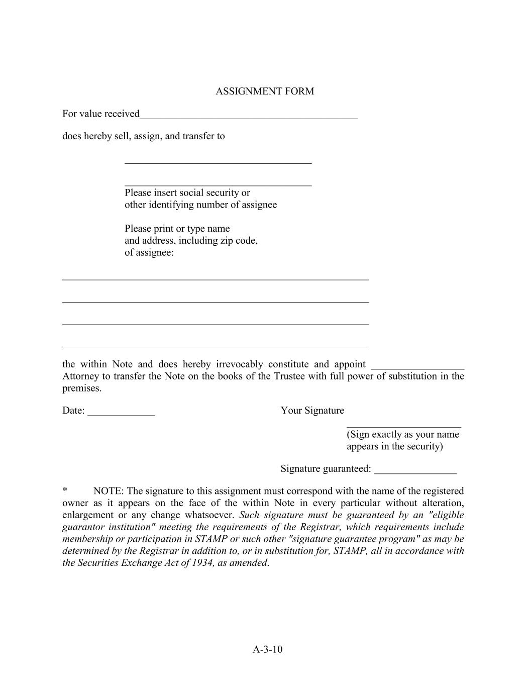ASSIGNMENT FORM For value received__________________________________________ does hereby sell, assign, and transfer to ____________________________________ ____________________________________ Please insert social security or other identifying number of assignee Please print or type name and address, including zip code, of assignee: ___________________________________________________________ ___________________________________________________________ ___________________________________________________________ ___________________________________________________________ the within Note and does hereby irrevocably constitute and appoint __________________ Attorney to transfer the Note on the books of the Trustee with full power of substitution in the premises. Date: _____________ Your Signature ______________________ (Sign exactly as your name appears in the security) Signature guaranteed: ________________ * NOTE: The signature to this assignment must correspond with the name of the registered owner as it appears on the face of the within Note in every particular without alteration, enlargement or any change whatsoever. Such signature must be guaranteed by an "eligible guarantor institution" meeting the requirements of the Registrar, which requirements include membership or participation in STAMP or such other "signature guarantee program" as may be determined by the Registrar in addition to, or in substitution for, STAMP, all in accordance with the Securities Exchange Act of 1934, as amended. A-3-10