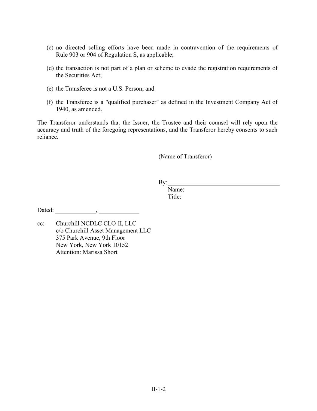 (c) no directed selling efforts have been made in contravention of the requirements of Rule 903 or 904 of Regulation S, as applicable; (d) the transaction is not part of a plan or scheme to evade the registration requirements of the Securities Act; (e) the Transferee is not a U.S. Person; and (f) the Transferee is a "qualified purchaser" as defined in the Investment Company Act of 1940, as amended. The Transferor understands that the Issuer, the Trustee and their counsel will rely upon the accuracy and truth of the foregoing representations, and the Transferor hereby consents to such reliance. (Name of Transferor) By: Name: Title: Dated: _____________, _____________ cc: Churchill NCDLC CLO-II, LLC c/o Churchill Asset Management LLC 375 Park Avenue, 9th Floor New York, New York 10152 Attention: Marissa Short B-1-2