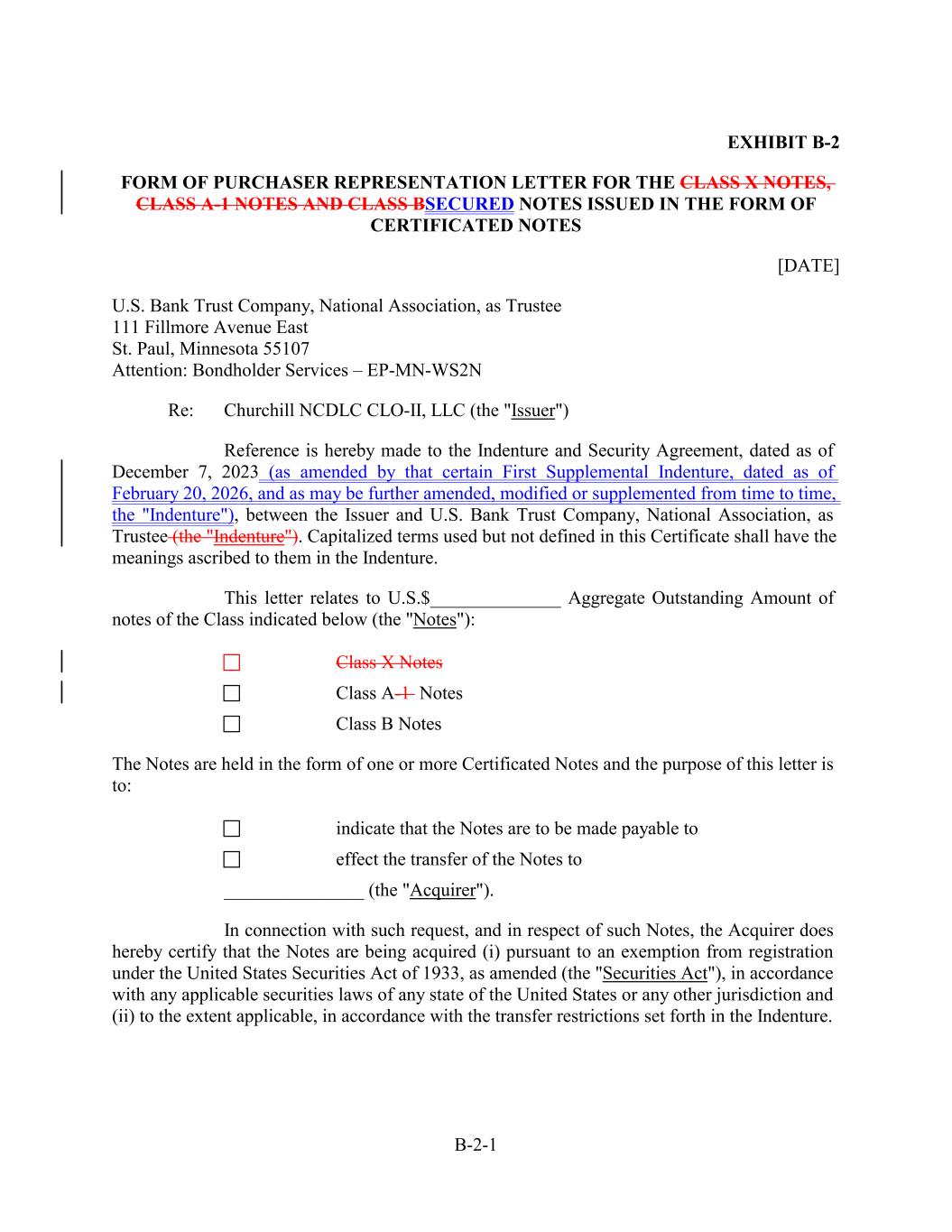 EXHIBIT B-2 FORM OF PURCHASER REPRESENTATION LETTER FOR THE CLASS X NOTES, CLASS A-1 NOTES AND CLASS BSECURED NOTES ISSUED IN THE FORM OF CERTIFICATED NOTES [DATE] U.S. Bank Trust Company, National Association, as Trustee 111 Fillmore Avenue East St. Paul, Minnesota 55107 Attention: Bondholder Services – EP-MN-WS2N Re: Churchill NCDLC CLO-II, LLC (the "Issuer") Reference is hereby made to the Indenture and Security Agreement, dated as of December 7, 2023 (as amended by that certain First Supplemental Indenture, dated as of February 20, 2026, and as may be further amended, modified or supplemented from time to time, the "Indenture"), between the Issuer and U.S. Bank Trust Company, National Association, as Trustee (the "Indenture"). Capitalized terms used but not defined in this Certificate shall have the meanings ascribed to them in the Indenture. This letter relates to U.S.$______________ Aggregate Outstanding Amount of notes of the Class indicated below (the "Notes"): Class X Notes Class A-1 Notes Class B Notes The Notes are held in the form of one or more Certificated Notes and the purpose of this letter is to: indicate that the Notes are to be made payable to effect the transfer of the Notes to _______________ (the "Acquirer"). In connection with such request, and in respect of such Notes, the Acquirer does hereby certify that the Notes are being acquired (i) pursuant to an exemption from registration under the United States Securities Act of 1933, as amended (the "Securities Act"), in accordance with any applicable securities laws of any state of the United States or any other jurisdiction and (ii) to the extent applicable, in accordance with the transfer restrictions set forth in the Indenture. B-2-1
