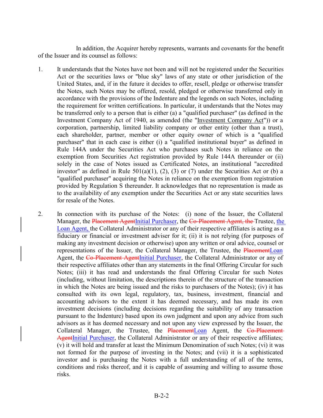In addition, the Acquirer hereby represents, warrants and covenants for the benefit of the Issuer and its counsel as follows: 1. It understands that the Notes have not been and will not be registered under the Securities Act or the securities laws or "blue sky" laws of any state or other jurisdiction of the United States, and, if in the future it decides to offer, resell, pledge or otherwise transfer the Notes, such Notes may be offered, resold, pledged or otherwise transferred only in accordance with the provisions of the Indenture and the legends on such Notes, including the requirement for written certifications. In particular, it understands that the Notes may be transferred only to a person that is either (a) a "qualified purchaser" (as defined in the Investment Company Act of 1940, as amended (the "Investment Company Act")) or a corporation, partnership, limited liability company or other entity (other than a trust), each shareholder, partner, member or other equity owner of which is a "qualified purchaser" that in each case is either (i) a "qualified institutional buyer" as defined in Rule 144A under the Securities Act who purchases such Notes in reliance on the exemption from Securities Act registration provided by Rule 144A thereunder or (ii) solely in the case of Notes issued as Certificated Notes, an institutional "accredited investor" as defined in Rule 501(a)(1), (2), (3) or (7) under the Securities Act or (b) a "qualified purchaser" acquiring the Notes in reliance on the exemption from registration provided by Regulation S thereunder. It acknowledges that no representation is made as to the availability of any exemption under the Securities Act or any state securities laws for resale of the Notes. 2. In connection with its purchase of the Notes: (i) none of the Issuer, the Collateral Manager, the Placement AgentInitial Purchaser, the Co-Placement Agent, the Trustee, the Loan Agent, the Collateral Administrator or any of their respective affiliates is acting as a fiduciary or financial or investment adviser for it; (ii) it is not relying (for purposes of making any investment decision or otherwise) upon any written or oral advice, counsel or representations of the Issuer, the Collateral Manager, the Trustee, the PlacementLoan Agent, the Co-Placement AgentInitial Purchaser, the Collateral Administrator or any of their respective affiliates other than any statements in the final Offering Circular for such Notes; (iii) it has read and understands the final Offering Circular for such Notes (including, without limitation, the descriptions therein of the structure of the transaction in which the Notes are being issued and the risks to purchasers of the Notes); (iv) it has consulted with its own legal, regulatory, tax, business, investment, financial and accounting advisors to the extent it has deemed necessary, and has made its own investment decisions (including decisions regarding the suitability of any transaction pursuant to the Indenture) based upon its own judgment and upon any advice from such advisors as it has deemed necessary and not upon any view expressed by the Issuer, the Collateral Manager, the Trustee, the PlacementLoan Agent, the Co-Placement AgentInitial Purchaser, the Collateral Administrator or any of their respective affiliates; (v) it will hold and transfer at least the Minimum Denomination of such Notes; (vi) it was not formed for the purpose of investing in the Notes; and (vii) it is a sophisticated investor and is purchasing the Notes with a full understanding of all of the terms, conditions and risks thereof, and it is capable of assuming and willing to assume those risks. B-2-2