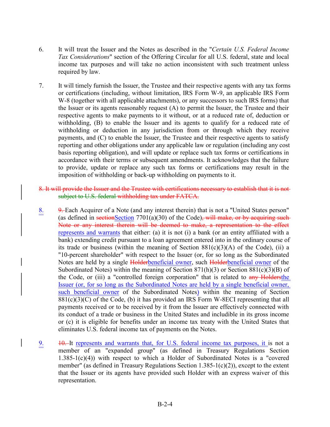 6. It will treat the Issuer and the Notes as described in the "Certain U.S. Federal Income Tax Considerations" section of the Offering Circular for all U.S. federal, state and local income tax purposes and will take no action inconsistent with such treatment unless required by law. 7. It will timely furnish the Issuer, the Trustee and their respective agents with any tax forms or certifications (including, without limitation, IRS Form W-9, an applicable IRS Form W-8 (together with all applicable attachments), or any successors to such IRS forms) that the Issuer or its agents reasonably request (A) to permit the Issuer, the Trustee and their respective agents to make payments to it without, or at a reduced rate of, deduction or withholding, (B) to enable the Issuer and its agents to qualify for a reduced rate of withholding or deduction in any jurisdiction from or through which they receive payments, and (C) to enable the Issuer, the Trustee and their respective agents to satisfy reporting and other obligations under any applicable law or regulation (including any cost basis reporting obligation), and will update or replace such tax forms or certifications in accordance with their terms or subsequent amendments. It acknowledges that the failure to provide, update or replace any such tax forms or certifications may result in the imposition of withholding or back-up withholding on payments to it. 8. It will provide the Issuer and the Trustee with certifications necessary to establish that it is not subject to U.S. federal withholding tax under FATCA. 8. 9. Each Acquirer of a Note (and any interest therein) that is not a "United States person" (as defined in sectionSection 7701(a)(30) of the Code), will make, or by acquiring such Note or any interest therein will be deemed to make, a representation to the effect represents and warrants that either: (a) it is not (i) a bank (or an entity affiliated with a bank) extending credit pursuant to a loan agreement entered into in the ordinary course of its trade or business (within the meaning of Section 881(c)(3)(A) of the Code), (ii) a "10-percent shareholder" with respect to the Issuer (or, for so long as the Subordinated Notes are held by a single Holderbeneficial owner, such Holderbeneficial owner of the Subordinated Notes) within the meaning of Section 871(h)(3) or Section 881(c)(3)(B) of the Code, or (iii) a "controlled foreign corporation" that is related to any Holdersthe Issuer (or, for so long as the Subordinated Notes are held by a single beneficial owner, such beneficial owner of the Subordinated Notes) within the meaning of Section 881(c)(3)(C) of the Code, (b) it has provided an IRS Form W-8ECI representing that all payments received or to be received by it from the Issuer are effectively connected with its conduct of a trade or business in the United States and includible in its gross income or (c) it is eligible for benefits under an income tax treaty with the United States that eliminates U.S. federal income tax of payments on the Notes. 9. 10. It represents and warrants that, for U.S. federal income tax purposes, it is not a member of an "expanded group" (as defined in Treasury Regulations Section 1.385-1(c)(4)) with respect to which a Holder of Subordinated Notes is a "covered member" (as defined in Treasury Regulations Section 1.385-1(c)(2)), except to the extent that the Issuer or its agents have provided such Holder with an express waiver of this representation. B-2-4