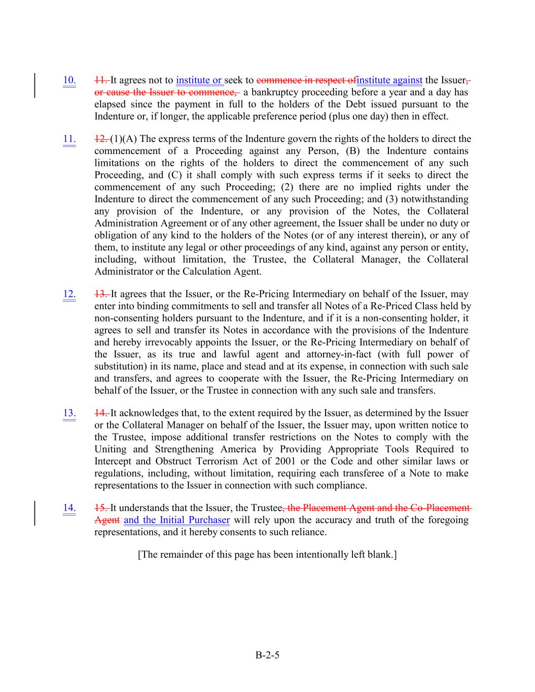 10. 11. It agrees not to institute or seek to commence in respect ofinstitute against the Issuer, or cause the Issuer to commence, a bankruptcy proceeding before a year and a day has elapsed since the payment in full to the holders of the Debt issued pursuant to the Indenture or, if longer, the applicable preference period (plus one day) then in effect. 11. 12. (1)(A) The express terms of the Indenture govern the rights of the holders to direct the commencement of a Proceeding against any Person, (B) the Indenture contains limitations on the rights of the holders to direct the commencement of any such Proceeding, and (C) it shall comply with such express terms if it seeks to direct the commencement of any such Proceeding; (2) there are no implied rights under the Indenture to direct the commencement of any such Proceeding; and (3) notwithstanding any provision of the Indenture, or any provision of the Notes, the Collateral Administration Agreement or of any other agreement, the Issuer shall be under no duty or obligation of any kind to the holders of the Notes (or of any interest therein), or any of them, to institute any legal or other proceedings of any kind, against any person or entity, including, without limitation, the Trustee, the Collateral Manager, the Collateral Administrator or the Calculation Agent. 12. 13. It agrees that the Issuer, or the Re-Pricing Intermediary on behalf of the Issuer, may enter into binding commitments to sell and transfer all Notes of a Re-Priced Class held by non-consenting holders pursuant to the Indenture, and if it is a non-consenting holder, it agrees to sell and transfer its Notes in accordance with the provisions of the Indenture and hereby irrevocably appoints the Issuer, or the Re-Pricing Intermediary on behalf of the Issuer, as its true and lawful agent and attorney-in-fact (with full power of substitution) in its name, place and stead and at its expense, in connection with such sale and transfers, and agrees to cooperate with the Issuer, the Re-Pricing Intermediary on behalf of the Issuer, or the Trustee in connection with any such sale and transfers. 13. 14. It acknowledges that, to the extent required by the Issuer, as determined by the Issuer or the Collateral Manager on behalf of the Issuer, the Issuer may, upon written notice to the Trustee, impose additional transfer restrictions on the Notes to comply with the Uniting and Strengthening America by Providing Appropriate Tools Required to Intercept and Obstruct Terrorism Act of 2001 or the Code and other similar laws or regulations, including, without limitation, requiring each transferee of a Note to make representations to the Issuer in connection with such compliance. 14. 15. It understands that the Issuer, the Trustee, the Placement Agent and the Co-Placement Agent and the Initial Purchaser will rely upon the accuracy and truth of the foregoing representations, and it hereby consents to such reliance. [The remainder of this page has been intentionally left blank.] B-2-5