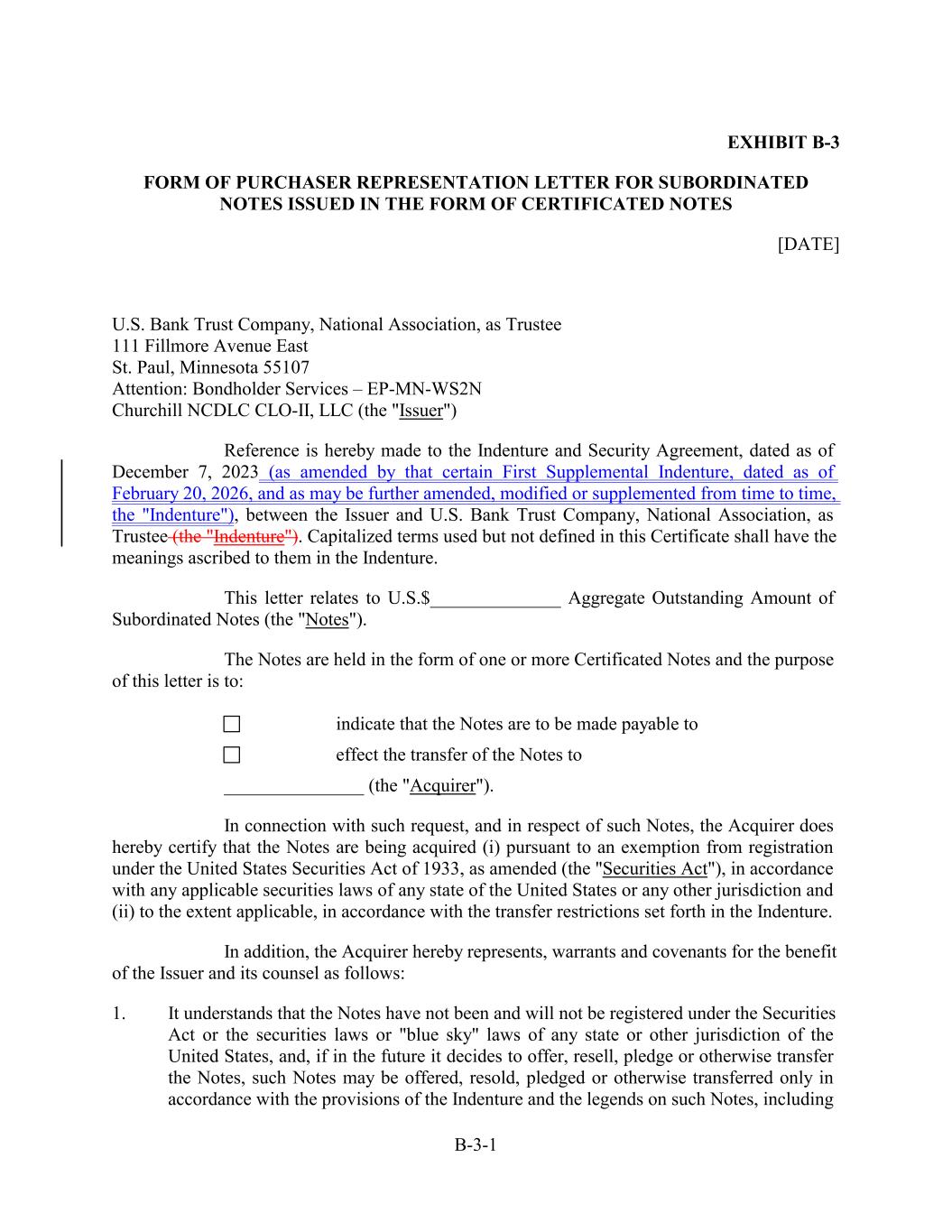 EXHIBIT B-3 FORM OF PURCHASER REPRESENTATION LETTER FOR SUBORDINATED NOTES ISSUED IN THE FORM OF CERTIFICATED NOTES [DATE] U.S. Bank Trust Company, National Association, as Trustee 111 Fillmore Avenue East St. Paul, Minnesota 55107 Attention: Bondholder Services – EP-MN-WS2N Churchill NCDLC CLO-II, LLC (the "Issuer") Reference is hereby made to the Indenture and Security Agreement, dated as of December 7, 2023 (as amended by that certain First Supplemental Indenture, dated as of February 20, 2026, and as may be further amended, modified or supplemented from time to time, the "Indenture"), between the Issuer and U.S. Bank Trust Company, National Association, as Trustee (the "Indenture"). Capitalized terms used but not defined in this Certificate shall have the meanings ascribed to them in the Indenture. This letter relates to U.S.$______________ Aggregate Outstanding Amount of Subordinated Notes (the "Notes"). The Notes are held in the form of one or more Certificated Notes and the purpose of this letter is to: indicate that the Notes are to be made payable to effect the transfer of the Notes to _______________ (the "Acquirer"). In connection with such request, and in respect of such Notes, the Acquirer does hereby certify that the Notes are being acquired (i) pursuant to an exemption from registration under the United States Securities Act of 1933, as amended (the "Securities Act"), in accordance with any applicable securities laws of any state of the United States or any other jurisdiction and (ii) to the extent applicable, in accordance with the transfer restrictions set forth in the Indenture. In addition, the Acquirer hereby represents, warrants and covenants for the benefit of the Issuer and its counsel as follows: 1. It understands that the Notes have not been and will not be registered under the Securities Act or the securities laws or "blue sky" laws of any state or other jurisdiction of the United States, and, if in the future it decides to offer, resell, pledge or otherwise transfer the Notes, such Notes may be offered, resold, pledged or otherwise transferred only in accordance with the provisions of the Indenture and the legends on such Notes, including B-3-1
