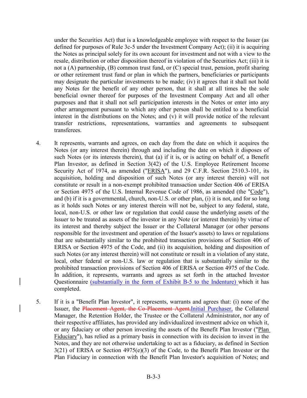 under the Securities Act) that is a knowledgeable employee with respect to the Issuer (as defined for purposes of Rule 3c-5 under the Investment Company Act); (ii) it is acquiring the Notes as principal solely for its own account for investment and not with a view to the resale, distribution or other disposition thereof in violation of the Securities Act; (iii) it is not a (A) partnership, (B) common trust fund, or (C) special trust, pension, profit sharing or other retirement trust fund or plan in which the partners, beneficiaries or participants may designate the particular investments to be made; (iv) it agrees that it shall not hold any Notes for the benefit of any other person, that it shall at all times be the sole beneficial owner thereof for purposes of the Investment Company Act and all other purposes and that it shall not sell participation interests in the Notes or enter into any other arrangement pursuant to which any other person shall be entitled to a beneficial interest in the distributions on the Notes; and (v) it will provide notice of the relevant transfer restrictions, representations, warranties and agreements to subsequent transferees. 4. It represents, warrants and agrees, on each day from the date on which it acquires the Notes (or any interest therein) through and including the date on which it disposes of such Notes (or its interests therein), that (a) if it is, or is acting on behalf of, a Benefit Plan Investor, as defined in Section 3(42) of the U.S. Employee Retirement Income Security Act of 1974, as amended ("ERISA"), and 29 C.F.R. Section 2510.3-101, its acquisition, holding and disposition of such Notes (or any interest therein) will not constitute or result in a non-exempt prohibited transaction under Section 406 of ERISA or Section 4975 of the U.S. Internal Revenue Code of 1986, as amended (the "Code"), and (b) if it is a governmental, church, non-U.S. or other plan, (i) it is not, and for so long as it holds such Notes or any interest therein will not be, subject to any federal, state, local, non-U.S. or other law or regulation that could cause the underlying assets of the Issuer to be treated as assets of the investor in any Note (or interest therein) by virtue of its interest and thereby subject the Issuer or the Collateral Manager (or other persons responsible for the investment and operation of the Issuer's assets) to laws or regulations that are substantially similar to the prohibited transaction provisions of Section 406 of ERISA or Section 4975 of the Code, and (ii) its acquisition, holding and disposition of such Notes (or any interest therein) will not constitute or result in a violation of any state, local, other federal or non-U.S. law or regulation that is substantially similar to the prohibited transaction provisions of Section 406 of ERISA or Section 4975 of the Code. In addition, it represents, warrants and agrees as set forth in the attached Investor Questionnaire (substantially in the form of Exhibit B-5 to the Indenture) which it has completed. 5. If it is a "Benefit Plan Investor", it represents, warrants and agrees that: (i) none of the Issuer, the Placement Agent, the Co-Placement Agent,Initial Purchaser, the Collateral Manager, the Retention Holder, the Trustee or the Collateral Administrator, nor any of their respective affiliates, has provided any individualized investment advice on which it, or any fiduciary or other person investing the assets of the Benefit Plan Investor ("Plan Fiduciary"), has relied as a primary basis in connection with its decision to invest in the Notes, and they are not otherwise undertaking to act as a fiduciary, as defined in Section 3(21) of ERISA or Section 4975(e)(3) of the Code, to the Benefit Plan Investor or the Plan Fiduciary in connection with the Benefit Plan Investor's acquisition of Notes; and B-3-3