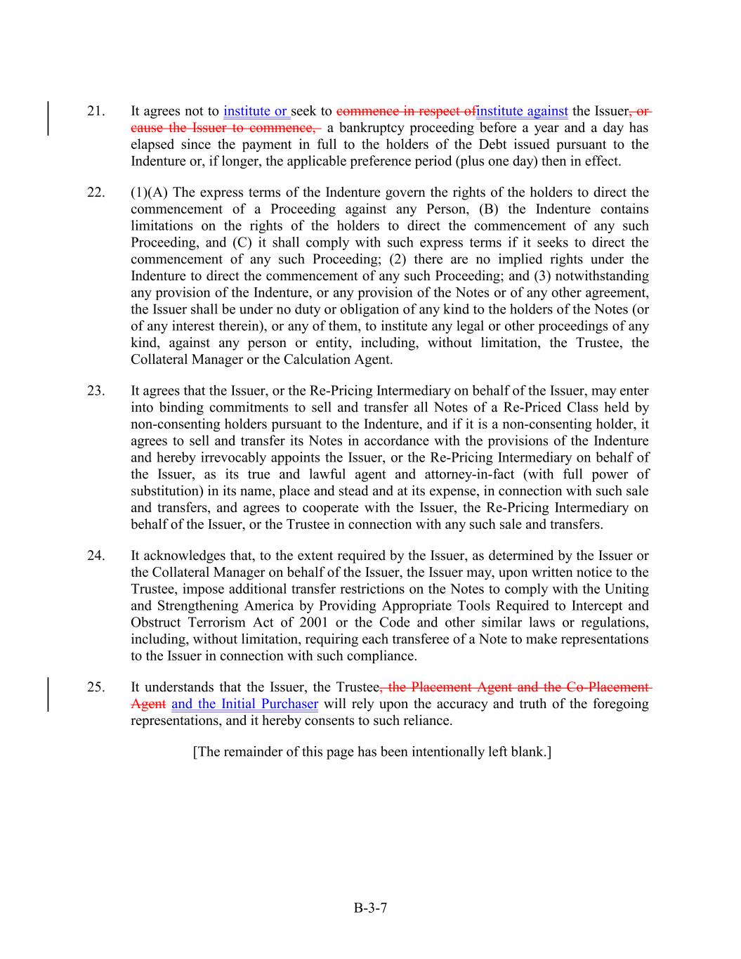 21. It agrees not to institute or seek to commence in respect ofinstitute against the Issuer, or cause the Issuer to commence, a bankruptcy proceeding before a year and a day has elapsed since the payment in full to the holders of the Debt issued pursuant to the Indenture or, if longer, the applicable preference period (plus one day) then in effect. 22. (1)(A) The express terms of the Indenture govern the rights of the holders to direct the commencement of a Proceeding against any Person, (B) the Indenture contains limitations on the rights of the holders to direct the commencement of any such Proceeding, and (C) it shall comply with such express terms if it seeks to direct the commencement of any such Proceeding; (2) there are no implied rights under the Indenture to direct the commencement of any such Proceeding; and (3) notwithstanding any provision of the Indenture, or any provision of the Notes or of any other agreement, the Issuer shall be under no duty or obligation of any kind to the holders of the Notes (or of any interest therein), or any of them, to institute any legal or other proceedings of any kind, against any person or entity, including, without limitation, the Trustee, the Collateral Manager or the Calculation Agent. 23. It agrees that the Issuer, or the Re-Pricing Intermediary on behalf of the Issuer, may enter into binding commitments to sell and transfer all Notes of a Re-Priced Class held by non-consenting holders pursuant to the Indenture, and if it is a non-consenting holder, it agrees to sell and transfer its Notes in accordance with the provisions of the Indenture and hereby irrevocably appoints the Issuer, or the Re-Pricing Intermediary on behalf of the Issuer, as its true and lawful agent and attorney-in-fact (with full power of substitution) in its name, place and stead and at its expense, in connection with such sale and transfers, and agrees to cooperate with the Issuer, the Re-Pricing Intermediary on behalf of the Issuer, or the Trustee in connection with any such sale and transfers. 24. It acknowledges that, to the extent required by the Issuer, as determined by the Issuer or the Collateral Manager on behalf of the Issuer, the Issuer may, upon written notice to the Trustee, impose additional transfer restrictions on the Notes to comply with the Uniting and Strengthening America by Providing Appropriate Tools Required to Intercept and Obstruct Terrorism Act of 2001 or the Code and other similar laws or regulations, including, without limitation, requiring each transferee of a Note to make representations to the Issuer in connection with such compliance. 25. It understands that the Issuer, the Trustee, the Placement Agent and the Co-Placement Agent and the Initial Purchaser will rely upon the accuracy and truth of the foregoing representations, and it hereby consents to such reliance. [The remainder of this page has been intentionally left blank.] B-3-7