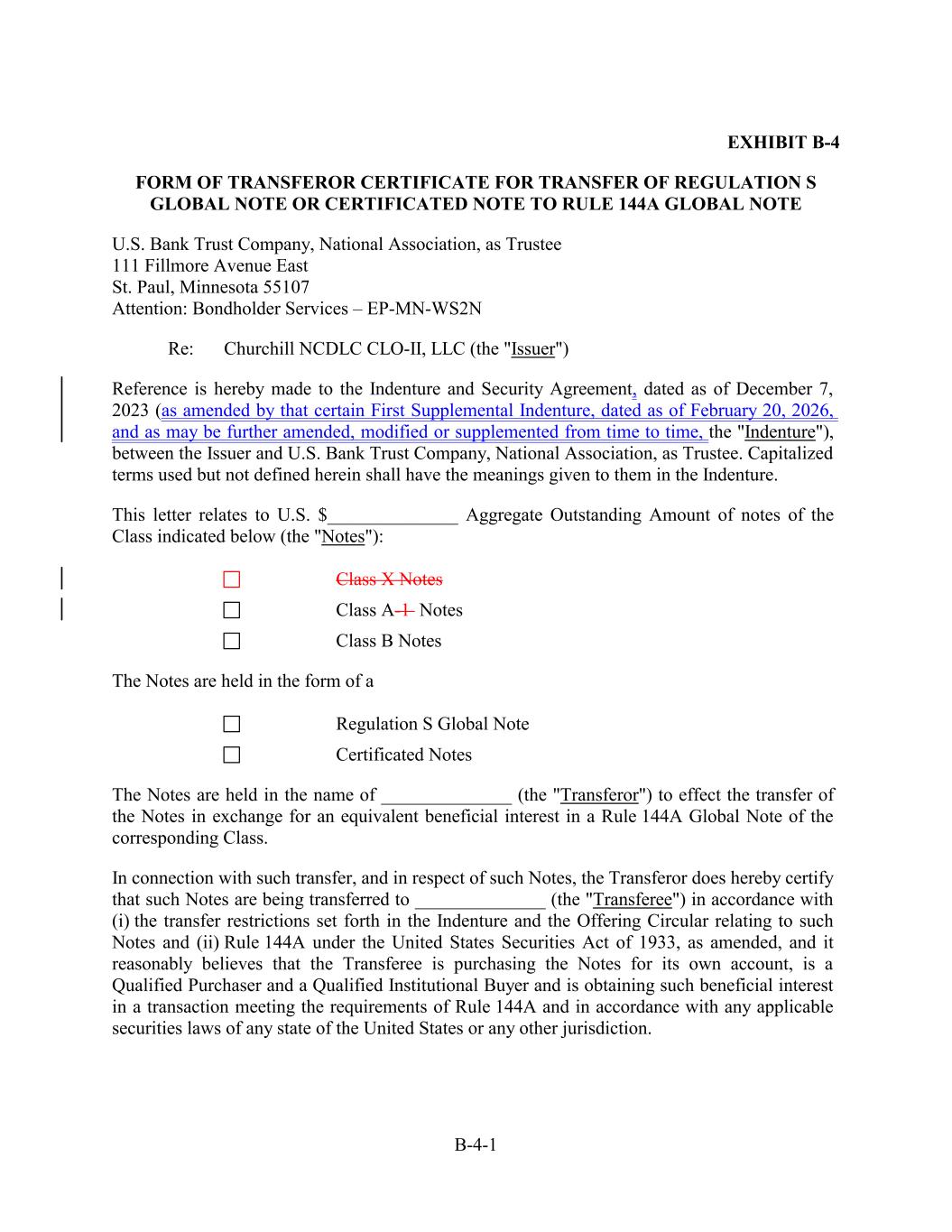 EXHIBIT B-4 FORM OF TRANSFEROR CERTIFICATE FOR TRANSFER OF REGULATION S GLOBAL NOTE OR CERTIFICATED NOTE TO RULE 144A GLOBAL NOTE U.S. Bank Trust Company, National Association, as Trustee 111 Fillmore Avenue East St. Paul, Minnesota 55107 Attention: Bondholder Services – EP-MN-WS2N Re: Churchill NCDLC CLO-II, LLC (the "Issuer") Reference is hereby made to the Indenture and Security Agreement, dated as of December 7, 2023 (as amended by that certain First Supplemental Indenture, dated as of February 20, 2026, and as may be further amended, modified or supplemented from time to time, the "Indenture"), between the Issuer and U.S. Bank Trust Company, National Association, as Trustee. Capitalized terms used but not defined herein shall have the meanings given to them in the Indenture. This letter relates to U.S. $______________ Aggregate Outstanding Amount of notes of the Class indicated below (the "Notes"): Class X Notes Class A-1 Notes Class B Notes The Notes are held in the form of a Regulation S Global Note Certificated Notes The Notes are held in the name of ______________ (the "Transferor") to effect the transfer of the Notes in exchange for an equivalent beneficial interest in a Rule 144A Global Note of the corresponding Class. In connection with such transfer, and in respect of such Notes, the Transferor does hereby certify that such Notes are being transferred to ______________ (the "Transferee") in accordance with (i) the transfer restrictions set forth in the Indenture and the Offering Circular relating to such Notes and (ii) Rule 144A under the United States Securities Act of 1933, as amended, and it reasonably believes that the Transferee is purchasing the Notes for its own account, is a Qualified Purchaser and a Qualified Institutional Buyer and is obtaining such beneficial interest in a transaction meeting the requirements of Rule 144A and in accordance with any applicable securities laws of any state of the United States or any other jurisdiction. B-4-1