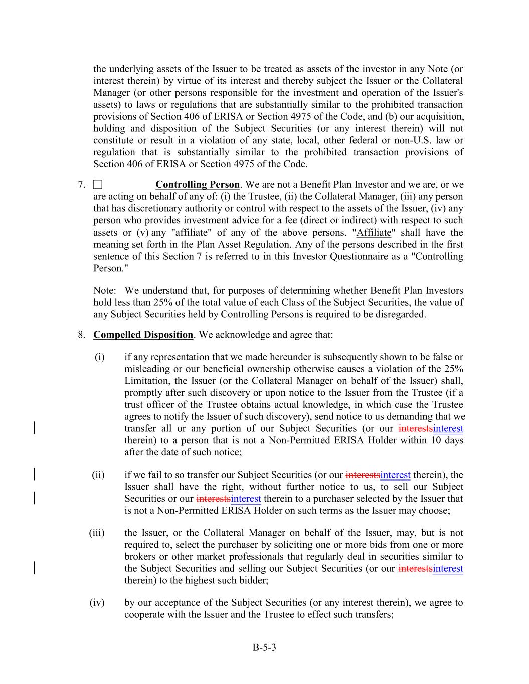 the underlying assets of the Issuer to be treated as assets of the investor in any Note (or interest therein) by virtue of its interest and thereby subject the Issuer or the Collateral Manager (or other persons responsible for the investment and operation of the Issuer's assets) to laws or regulations that are substantially similar to the prohibited transaction provisions of Section 406 of ERISA or Section 4975 of the Code, and (b) our acquisition, holding and disposition of the Subject Securities (or any interest therein) will not constitute or result in a violation of any state, local, other federal or non-U.S. law or regulation that is substantially similar to the prohibited transaction provisions of Section 406 of ERISA or Section 4975 of the Code. 7. Controlling Person. We are not a Benefit Plan Investor and we are, or we are acting on behalf of any of: (i) the Trustee, (ii) the Collateral Manager, (iii) any person that has discretionary authority or control with respect to the assets of the Issuer, (iv) any person who provides investment advice for a fee (direct or indirect) with respect to such assets or (v) any "affiliate" of any of the above persons. "Affiliate" shall have the meaning set forth in the Plan Asset Regulation. Any of the persons described in the first sentence of this Section 7 is referred to in this Investor Questionnaire as a "Controlling Person." Note: We understand that, for purposes of determining whether Benefit Plan Investors hold less than 25% of the total value of each Class of the Subject Securities, the value of any Subject Securities held by Controlling Persons is required to be disregarded. 8. Compelled Disposition. We acknowledge and agree that: (i) if any representation that we made hereunder is subsequently shown to be false or misleading or our beneficial ownership otherwise causes a violation of the 25% Limitation, the Issuer (or the Collateral Manager on behalf of the Issuer) shall, promptly after such discovery or upon notice to the Issuer from the Trustee (if a trust officer of the Trustee obtains actual knowledge, in which case the Trustee agrees to notify the Issuer of such discovery), send notice to us demanding that we transfer all or any portion of our Subject Securities (or our interestsinterest therein) to a person that is not a Non-Permitted ERISA Holder within 10 days after the date of such notice; (ii) if we fail to so transfer our Subject Securities (or our interestsinterest therein), the Issuer shall have the right, without further notice to us, to sell our Subject Securities or our interestsinterest therein to a purchaser selected by the Issuer that is not a Non-Permitted ERISA Holder on such terms as the Issuer may choose; (iii) the Issuer, or the Collateral Manager on behalf of the Issuer, may, but is not required to, select the purchaser by soliciting one or more bids from one or more brokers or other market professionals that regularly deal in securities similar to the Subject Securities and selling our Subject Securities (or our interestsinterest therein) to the highest such bidder; (iv) by our acceptance of the Subject Securities (or any interest therein), we agree to cooperate with the Issuer and the Trustee to effect such transfers; B-5-3