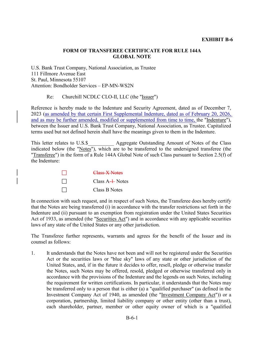 EXHIBIT B-6 FORM OF TRANSFEREE CERTIFICATE FOR RULE 144A GLOBAL NOTE U.S. Bank Trust Company, National Association, as Trustee 111 Fillmore Avenue East St. Paul, Minnesota 55107 Attention: Bondholder Services – EP-MN-WS2N Re: Churchill NCDLC CLO-II, LLC (the "Issuer") Reference is hereby made to the Indenture and Security Agreement, dated as of December 7, 2023 (as amended by that certain First Supplemental Indenture, dated as of February 20, 2026, and as may be further amended, modified or supplemented from time to time, the "Indenture"), between the Issuer and U.S. Bank Trust Company, National Association, as Trustee. Capitalized terms used but not defined herein shall have the meanings given to them in the Indenture. This letter relates to U.S.$__________ Aggregate Outstanding Amount of Notes of the Class indicated below (the "Notes"), which are to be transferred to the undersigned transferee (the "Transferee") in the form of a Rule 144A Global Note of such Class pursuant to Section 2.5(f) of the Indenture: Class X Notes Class A-1 Notes Class B Notes In connection with such request, and in respect of such Notes, the Transferee does hereby certify that the Notes are being transferred (i) in accordance with the transfer restrictions set forth in the Indenture and (ii) pursuant to an exemption from registration under the United States Securities Act of 1933, as amended (the "Securities Act") and in accordance with any applicable securities laws of any state of the United States or any other jurisdiction. The Transferee further represents, warrants and agrees for the benefit of the Issuer and its counsel as follows: 1. It understands that the Notes have not been and will not be registered under the Securities Act or the securities laws or "blue sky" laws of any state or other jurisdiction of the United States, and, if in the future it decides to offer, resell, pledge or otherwise transfer the Notes, such Notes may be offered, resold, pledged or otherwise transferred only in accordance with the provisions of the Indenture and the legends on such Notes, including the requirement for written certifications. In particular, it understands that the Notes may be transferred only to a person that is either (a) a "qualified purchaser" (as defined in the Investment Company Act of 1940, as amended (the "Investment Company Act")) or a corporation, partnership, limited liability company or other entity (other than a trust), each shareholder, partner, member or other equity owner of which is a "qualified B-6-1